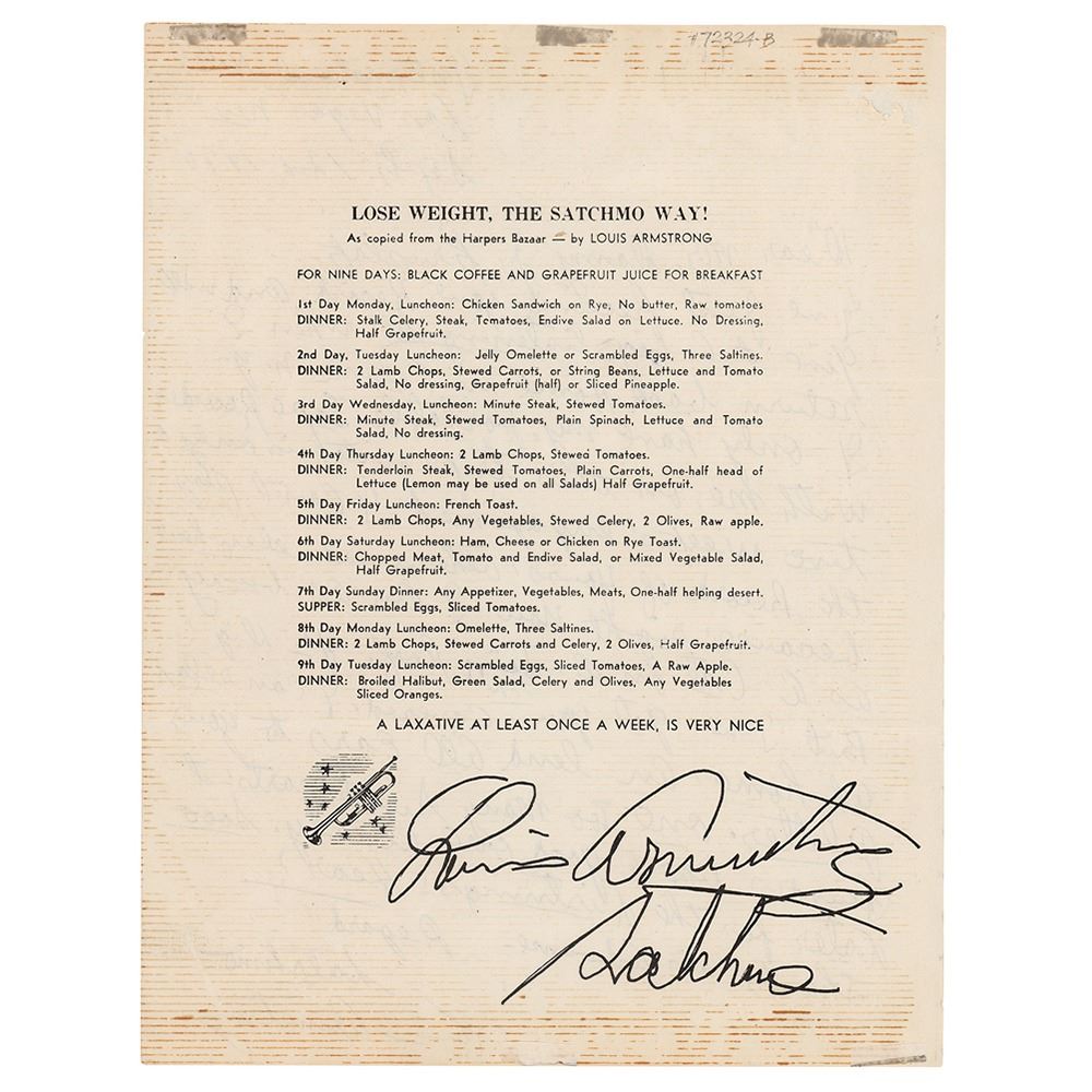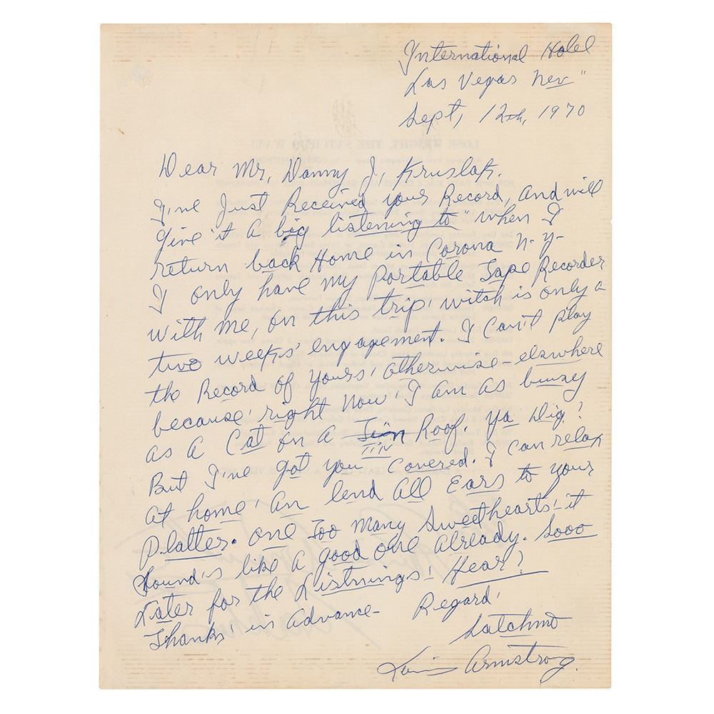 ALS signed “Satchmo, Louis Armstrong,†one page on the reverse of an 8.5 x 11 'Lose Weight The 'Satchmo' Way' flyer (featuring his facsimile signature), September 12, 1970. Addressed from the International Hotel in Las Vegas, a handwritten letter to Danny J. Kruslak, in full (spelling and grammar retained): “I’ve just received your record, and will give it a big listening to when I return back home in Corona N.Y. I only have my portable tape recorder with me, on this trip, witch is only a two weeks’ engagement. I can’t play the record of yours’ otherwise-elsewhere because right now, I am as busy as a cat on a tin roof. Ya dig? But I’ve got you covered. I can relax at home an lend all ears to your platter. One too many sweethearts—it sound’s like a good one already. Sooo later for the listenings! Hear? Thanks in advance.†In fine condition, with light horizontal lines from onetime inclusion in a magnetic photo album. Accompanied by a certificate of authenticity from Traces Ecrites of Paris.