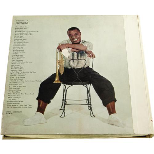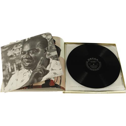 <B>Louis Armstrong Autograph and Rare "Satchmo" Record Set.</B></I> Includes a notepad leaf inscribed "Best wishes" and signed by Armstrong in black ink, along with a scarce copy of the very collectable, limited edition four-record box set titled <I>Satchmo...A Musical Autobiography of Louis Armstrong</B></I> (Decca DXM-155), featuring 48 tracks recorded in the late 1940s and early '50s, most of them revisiting Armstrong classics from the '20s and '30s, and including Satchmo's autobiographical narration. The elaborate oversize box/book includes beautiful color and b&w photos, and each record is housed in a specially-printed plastic sleeve and are in M- condition. The autograph is in Excellent condition and the box is in VG++ condition with some corner bumping and a split along the length of the front cover hinge. <I>Accompanied by LOA from PSA/DNA.</B></I>