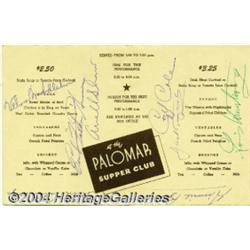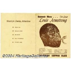 <B>Louis Armstrong Autographed Menu.</B></I> A souvenir menu from the Palomar Supper Club, signed by Louis Armstrong, "Father" Earl Hines, Jack Teagarden, Velma Middleton, and others. <BR><BR><B>Important notice:</B> Heritage usually auctions material at the rate of 200-250 lots per hour. On some occasions eBay Live bid software or the Internet may not be able to keep up with the pace of the auction. We recommend placing a realistic absentee bid now as insurance to avoid disappointment. Occasionally the auctioneer may eliminate or reject an eBay Live bid, and the auctioneer may also reopen a lot after the close of the eBay live bidding (usually because we missed an audience bid), and may reject your bid even if it shows you as the winning bidder. By bidding via eBay Live, you agree that Heritage may award the lot to another bidder at its sole discretion under the circumstances described above or any other reasonable circumstances. Since eBay bids are not shown to us until we open the lot on the floor, we treat those bids just like floor bids. In most cases the floor responds before the eBay bid is presented to us, due to Internet lag time, so for consistency we have made it a policy that floor bids are always considered first over tie eBay live bids. Also please note that all Heritage lots purchased through eBay Live carry a 24.5% Buyer's Premium. Please make sure you read the Terms and Conditions before you bid.