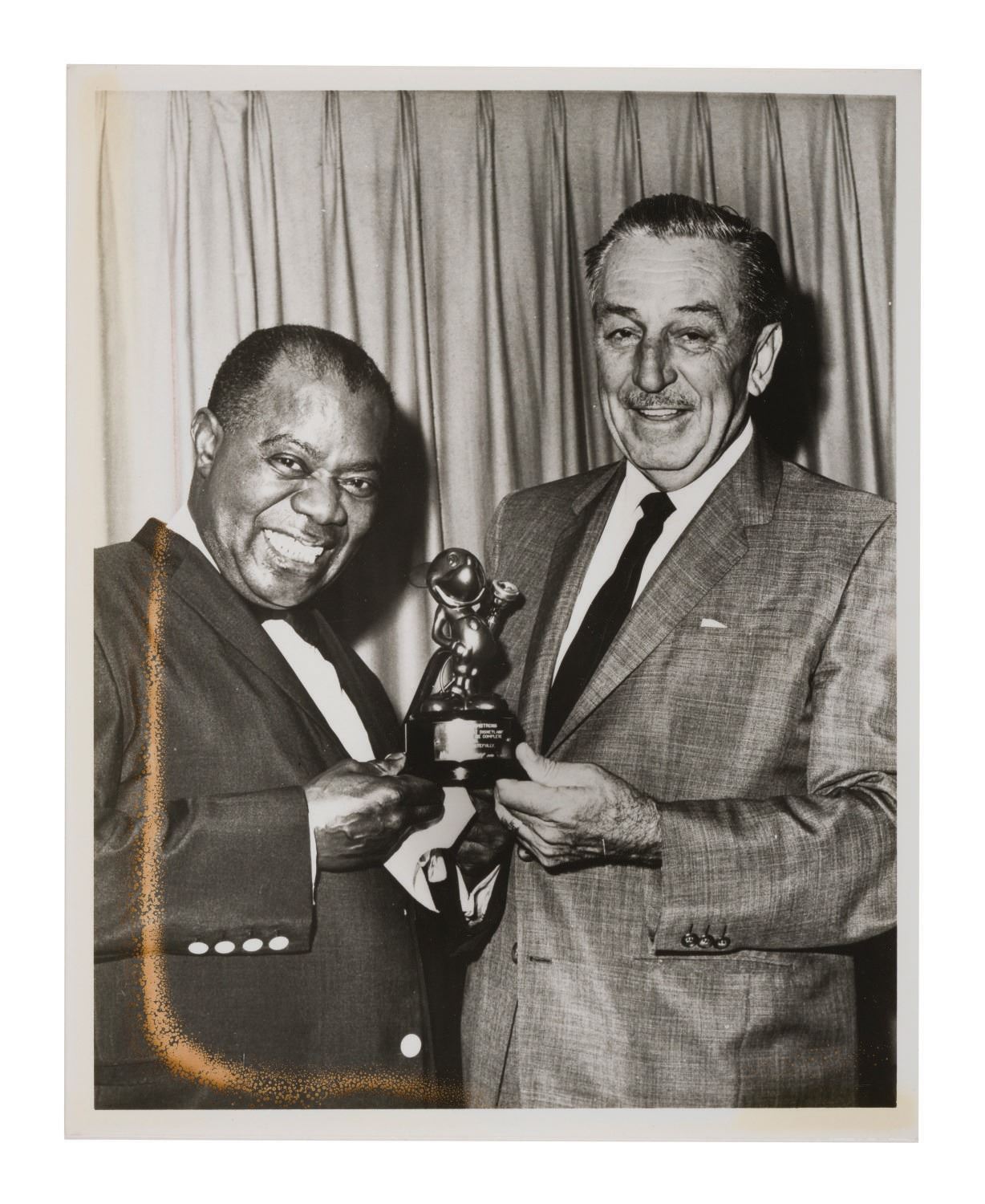(Disney, 1960s) A photograph of musician Louis Armstrong and Walt Disney. The photograph commemorates the Dixieland musician's receipt of a prestigious "Mousecar" award for his participation in the Disneyland After Dark seasonal celebrations. Measuring 8"x10", the photo is in good condition, despite minor yellowing and some areas of wear.