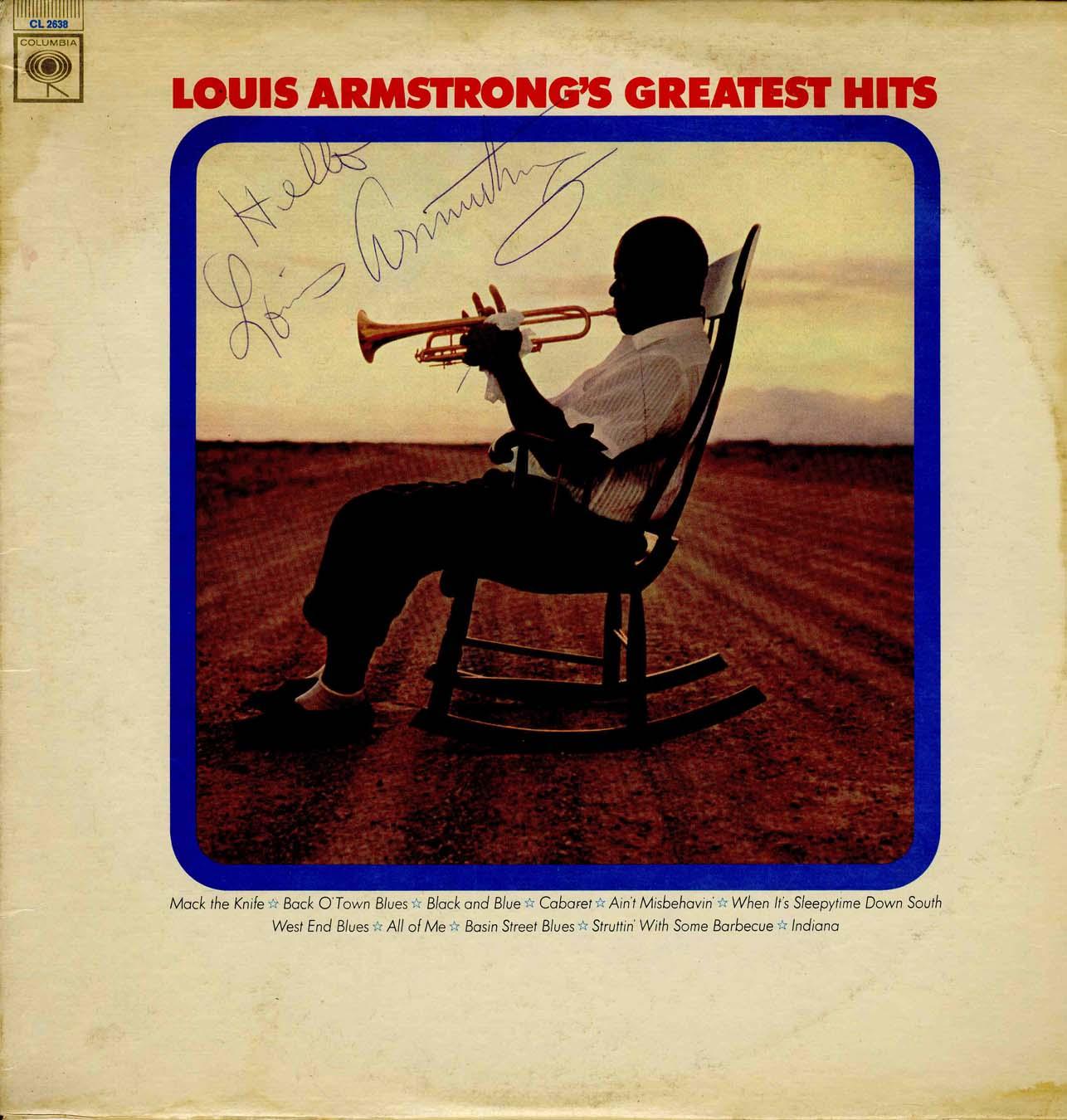 Signed album ''Louis Armstrong's Greatest Hits,'' circa 1965, showing Satchmo playing trumpet on a rocking chair, signed at left: ''Hello Louis Armstrong''. Margins a bit dampstained and some slight ''ring wear'' from album impression, else very good. Nice, strong signature.
