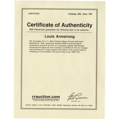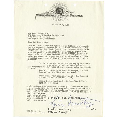 <B>Louis Armstrong Signed Contract.</B></I> A two-page contract on MGM letterhead dated December 9, 1955, engaging Armstrong's exclusive services for a photoplay titled <I>High Society,</B></I> signed on the last page in blue ink. In Very FIne to Excellent condition with the usual staple and binder holes to the top edge.<BR><BR><b>Shipping:</b> Flat Material, Small (<a target="_blank" href="http://www.heritageauctions.com/common/shipping.php">view shipping information</a>)