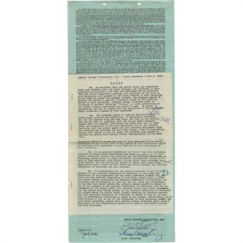 <B>Louis Armstrong Signed Movie Contract.</B></I> A single-page, double-sided Screen Actors Guild freelance contract dated June 2, 1947, engaging Satchmo to appear as himself in the musical comedy <I>That's Life</B></I> (released in 1948 as <I>A Song is Born</B></I>) for a sum of $2,500 per week for three weeks. The document is signed on the back by Armstrong in blue ink, and initialed twice by him on the attached rider. By the way, his original nickname was "Satchelmouth" -- a London music magazine mistakenly wrote "Satchmo" in 1932 and it stuck. In Fine condition with mild general wear and tear, fold creases, mild fading, staples along the right edge, and the usual binder and staple holes along the top edge.<I>Accompanied by LOA from PSA/DNA.</B></I><BR><BR><b>Shipping:</b> Small Flat (<a target="_blank" href="http://www.heritageauctions.com/common/shipping.php">view shipping information</a>)