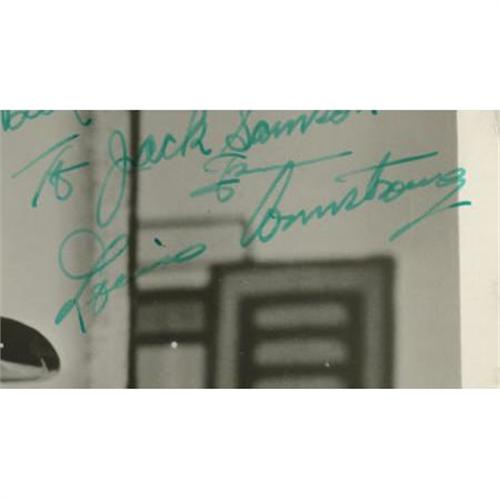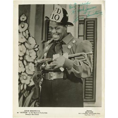 <B>Louis Armstrong Signed Photo.</B></I> A great b&w 8" x 10" promo still of Armstrong as "Bottom" in the stage musical <I>Swing'n the Dream,</B></I> inscribed and signed by the Jazz legend in green felt tip. In Very Fine condition with mild wear, corner creases, and faint discoloration along the edges. <I>Accompanied by LOA from PSA/DNA.</B></I><BR><BR><b>Shipping:</b> Flat Material, Small (<a target="_blank" href="http://www.heritageauctions.com/common/shipping.php">view shipping information</a>)