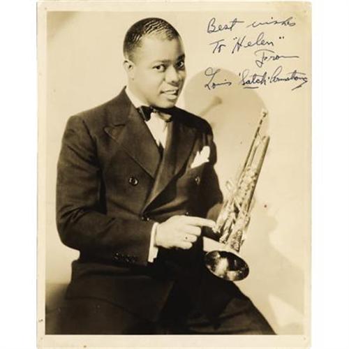 <B>Louis Armstrong Signed Photo.</B></I> A vintage b&w 8" x 10" photo of the Jazz trumpeter, inscribed and signed "Louis 'Satch' Armstrong" by him in blue ink, with his manager Joe Glaser's stamp en verso. In Fine to Very Fine condition with moderate toning, mild edge wear, and tack holes to the corners.<BR><BR><b>Shipping:</b> Flat Material, Small (<a target="_blank" href="http://www.heritageauctions.com/common/shipping.php">view shipping information</a>)