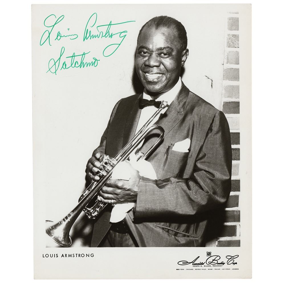 Glossy 8 x 10 publicity photo of Armstrong posing with his trumpet in later age, signed nicely in green ink, "Louis Armstrong, Satchmo." In fine condition.
