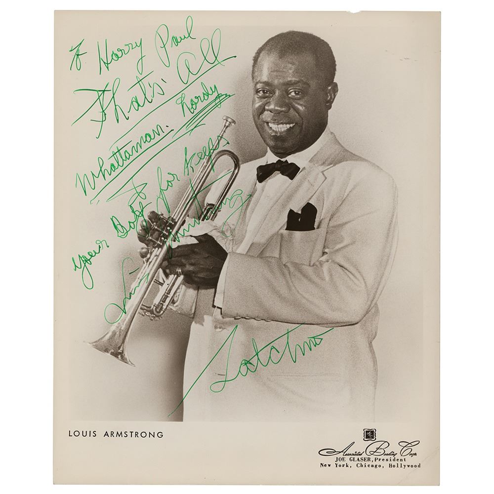 Vintage glossy 8 x 10 Associated Booking Corp. publicity photo of Satchmo striking a pose with his trumpet, signed and inscribed in green fountain pen, "To Harry Paul, That's All, Whattaman, Lordy, your boy for keeps, Louis Armstrong, Satchmo.” In fine condition, with a trivial chip to the top edge.