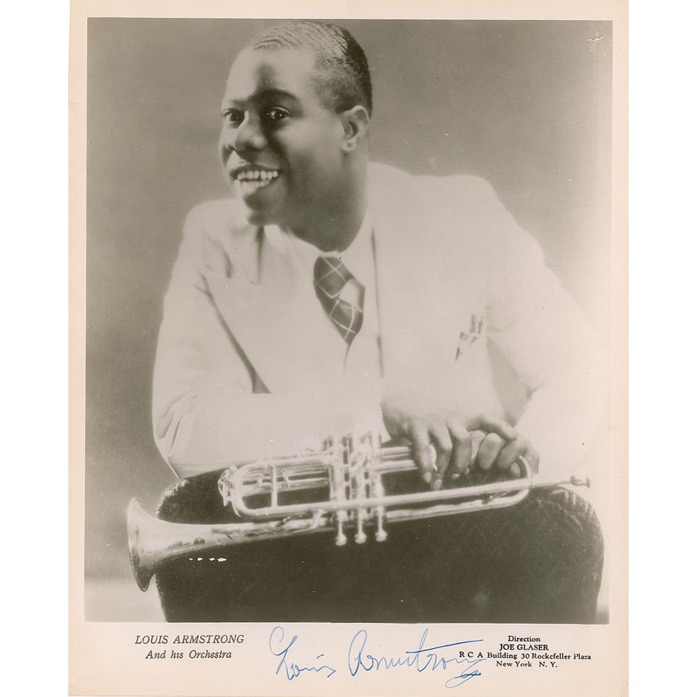 Superb vintage glossy 8 x 10 publicity photo of Armstrong with his trumpet as a young man, signed in the lower border in fountain pen. In fine condition.