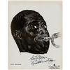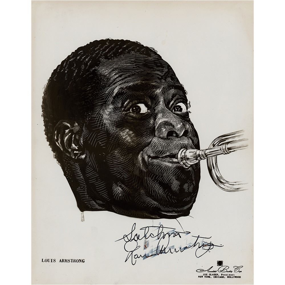 Vintage glossy 8 x 10 Associated Booking Corp. photo of an illustration of Armstrong playing his trumpet, signed in fountain pen, "Satchmo, Louis Armstrong." In very good condition, with scattered creasing and brushing to the signature.