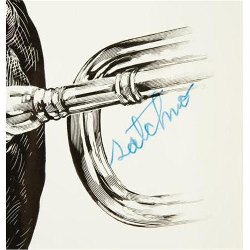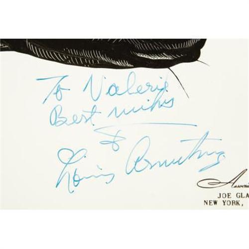 <B>Louis Armstrong Signed Photograph.</B></I> An 8" x 10" print of an etching of great American Jazz musician Louis Armstrong by Zadig, signed "To Valerie Best Wishes Louis Armstrong, Satchmo." Bottom reads "Louis Armstrong, Associated Booking Corp., Joe Glaser, President, New York, Chicago, Hollywood." This piece is in Very Fine condition, with minor surface wear and some smudging of the blue ink inscription but the signature is large and clean. <I>Accompanied by a COA from PSA/DNA.</B></I><B>Condition Report:</B> This piece is in Very Fine condition, with minor surface wear . There is some smudging of the blue ink autograph, while the signiture is large and clearn.<BR><BR><b>Shipping:</b> Flat Material, Small (<a target="_blank" href="http://www.heritageauctions.com/common/shipping.php">view shipping information</a>)