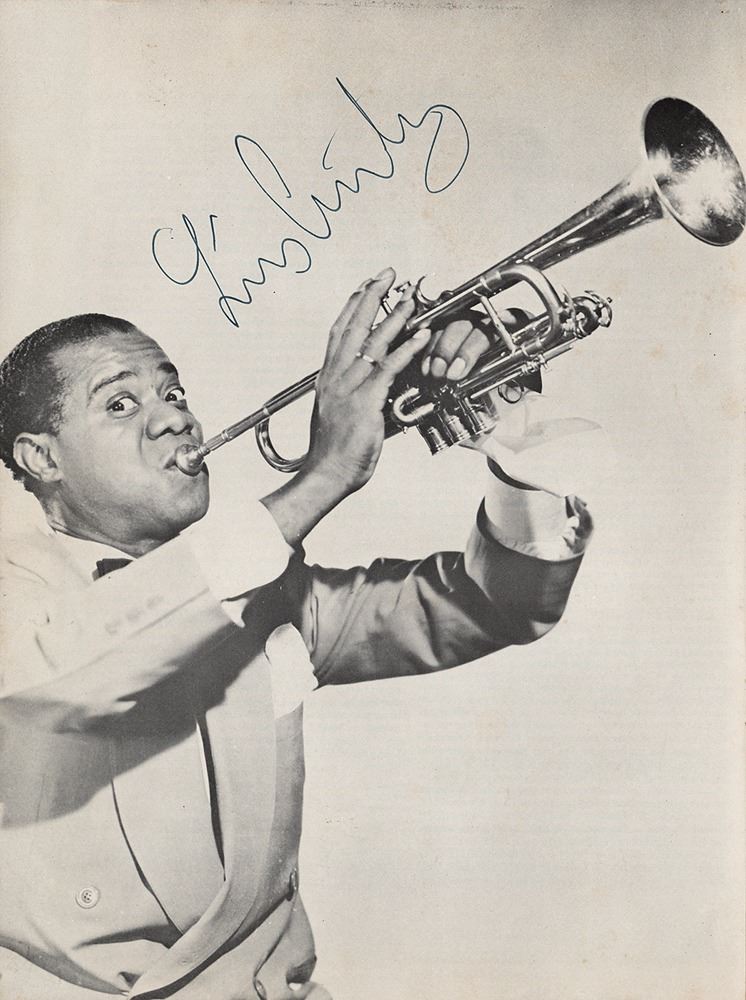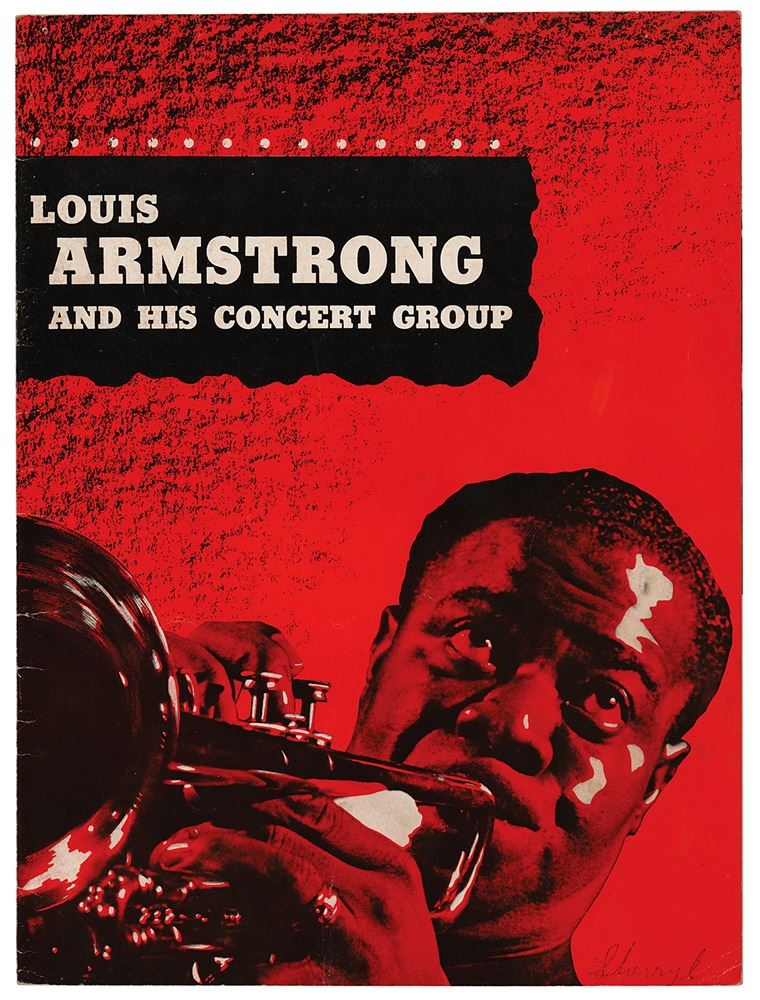 Program for Louis Armstrong and His Concert Group, 20 pages, 9 x 12, signed inside in fountain pen by Louis Armstrong on a nice full-page image. Also signed on the last page by drummer Barrett Deems. In fine condition, with light handling wear.