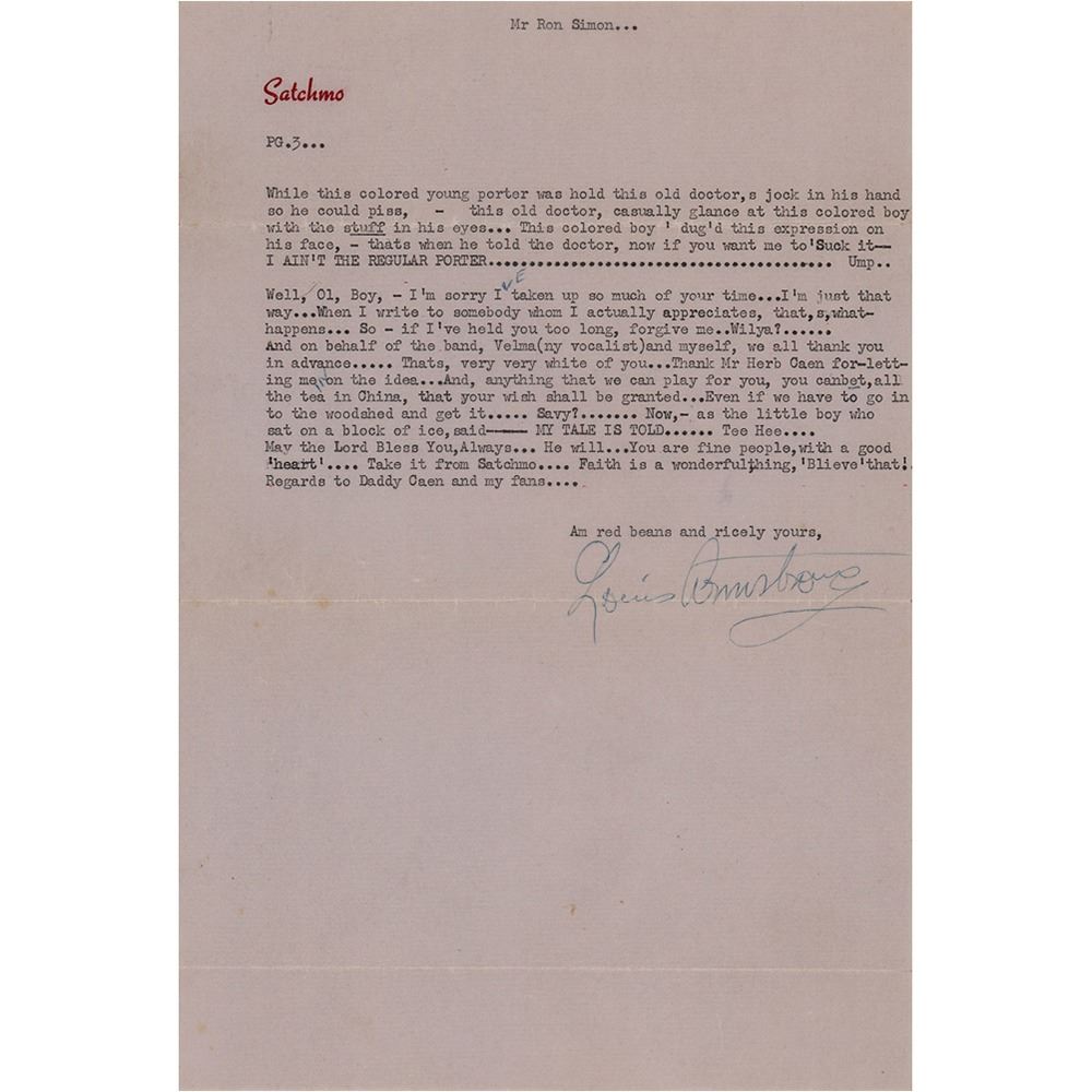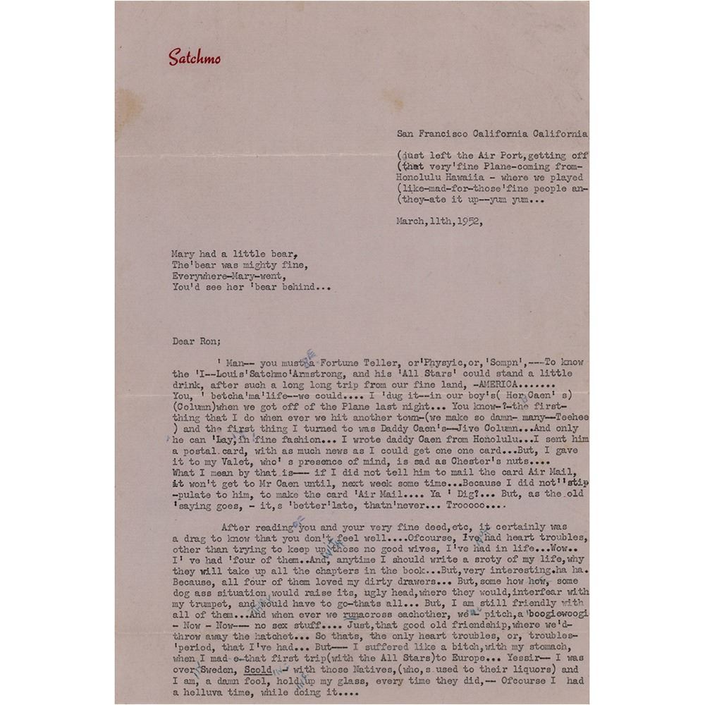 TLS, three pages, 7.25 x 10.75, personal "Satchmo" letterhead, March 11, 1952. Letter to Ron Simon, sent from San Francisco, where he "just left the Air Port, getting off that very fine Plane—coming from Honolulu…where we played like-mad-for-those fine people and they-ate it up-yum yum." Written in stylish, jazzy prose, Armstrong's letter reads, in part: "Man—you must be a Fortune Teller, or Physyic, or, 'Sompn,'—to know the I—Louis 'Satchmo' Armstrong, and his 'All stars; could stand a little drink, after such a long long trip from our fine land,—America….you 'betcha'ma'life—we could…I dug it—in our boy's (Herb Caen's) (Column) when we got off the Plane…You know? The first thing that I do when ever we hit another town—(we make so damn-many—Teehee) and the first thing I turned to was Daddy Caen's—Jive Column…