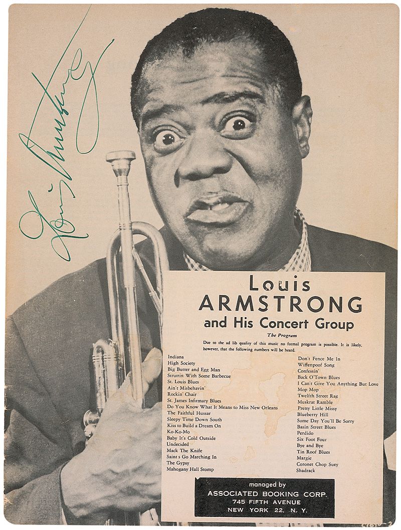 Program for Louis Armstrong and His Concert Group, 9 x 12, signed vertically on the first page in green fountain pen. Also signed six members of his band near their images: Vera Middleton, Trummy Young, Edmond Hall, Billy Kyle, Danny Barcelona, and Mort Herbert. In good condition, with complete separation of the front cover and Armstrong’s signed page, scattered staining to the lower right of Armstrong’s page, creases, toning, and soiling to the front cover, complete separation of the final page, and back cover absent.