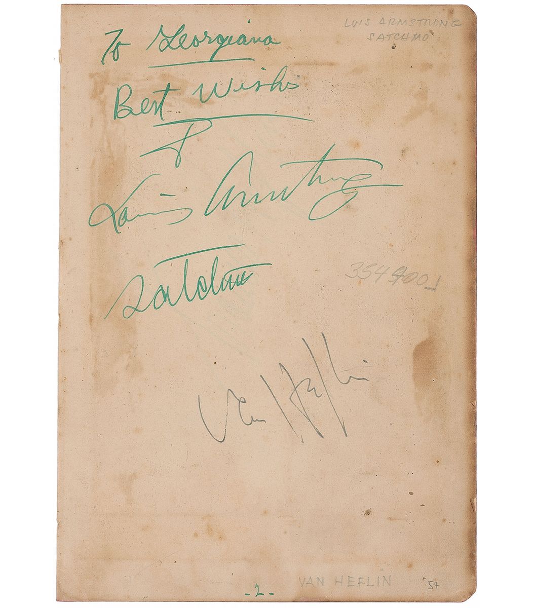 Fountain pen signatures and inscription, “To Georgiana, Best wishes, Louis Armstrong, Satchmo” and “Van Heflin,” on an off-white 5.5 x 7.75 album page. In very good condition, with moderate scattered staining.