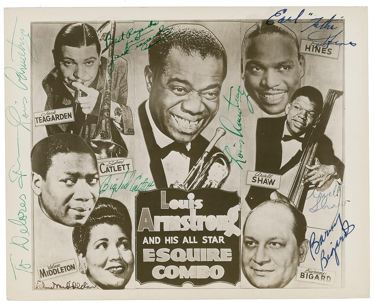Vintage glossy 10 x 8 photo of a poster for Louis Armstrong and His All Star Esquire Combo, signed and inscribed vertically in the left border in green fountain pen “To Delores from Louis Armstrong.” Also signed again in green fountain pen by Armstrong next to his image. The remaining members of his group have signed near their images in various color fountain pen: Earl ‘Fatha’ Hines, Jack Teagarden, Big Sid Catlett, Velma Middleton, Barney Bigard, and Arvell Shaw. In fine condition, with a few scattered edge marks and creases, and some light vertical curling. A boldly signed example of one of Armstrong’s classic line-ups.