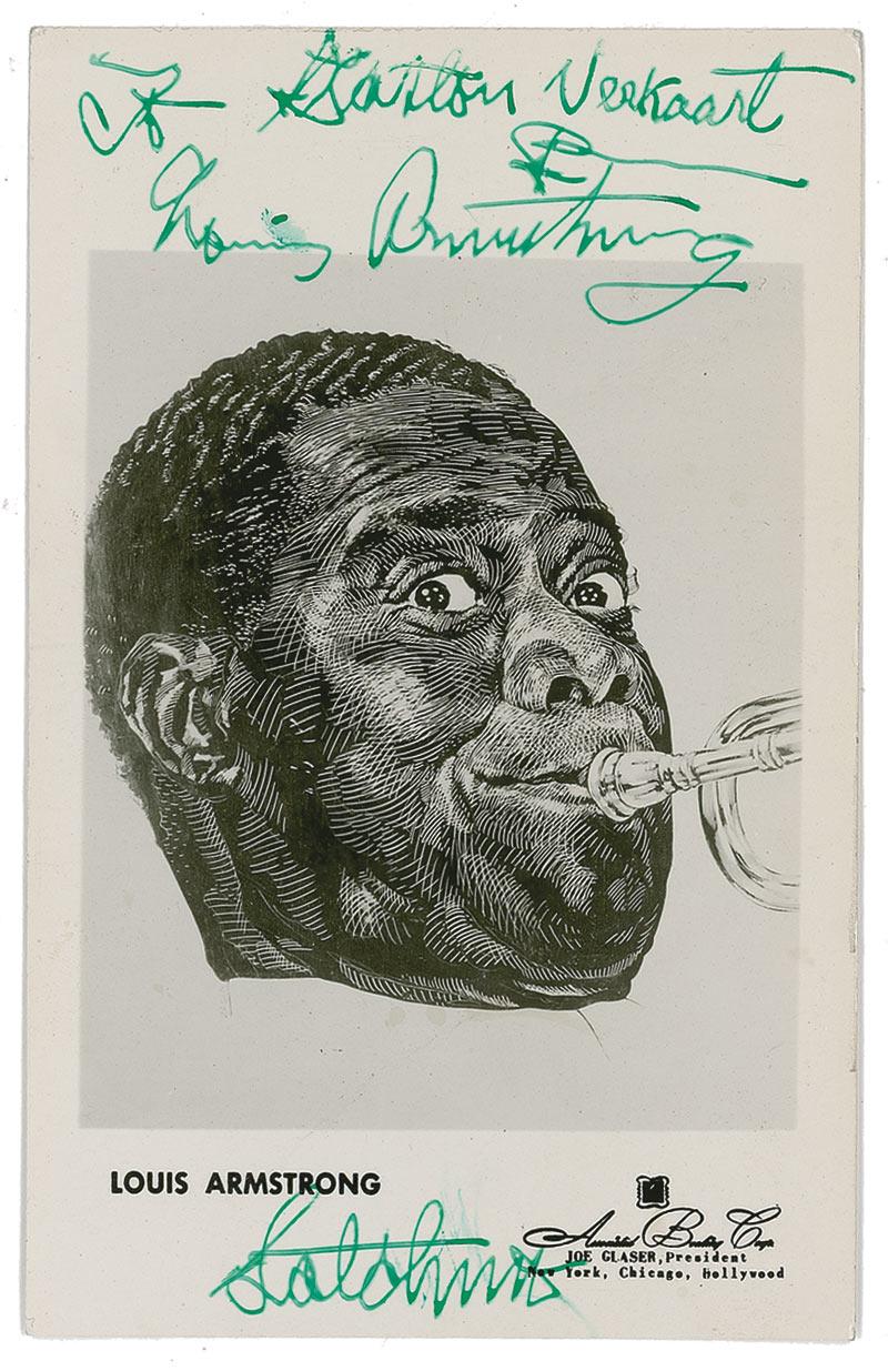 Vintage 3.5 x 5.5 postcard photo, signed and inscribed in green ink “To Dalton Veekaart, Louis Armstrong, Satchmo.” In very good condition, with scattered creases and surface marks, a couple brushes to signature, and light irregular ink adhesion to signature and inscription.