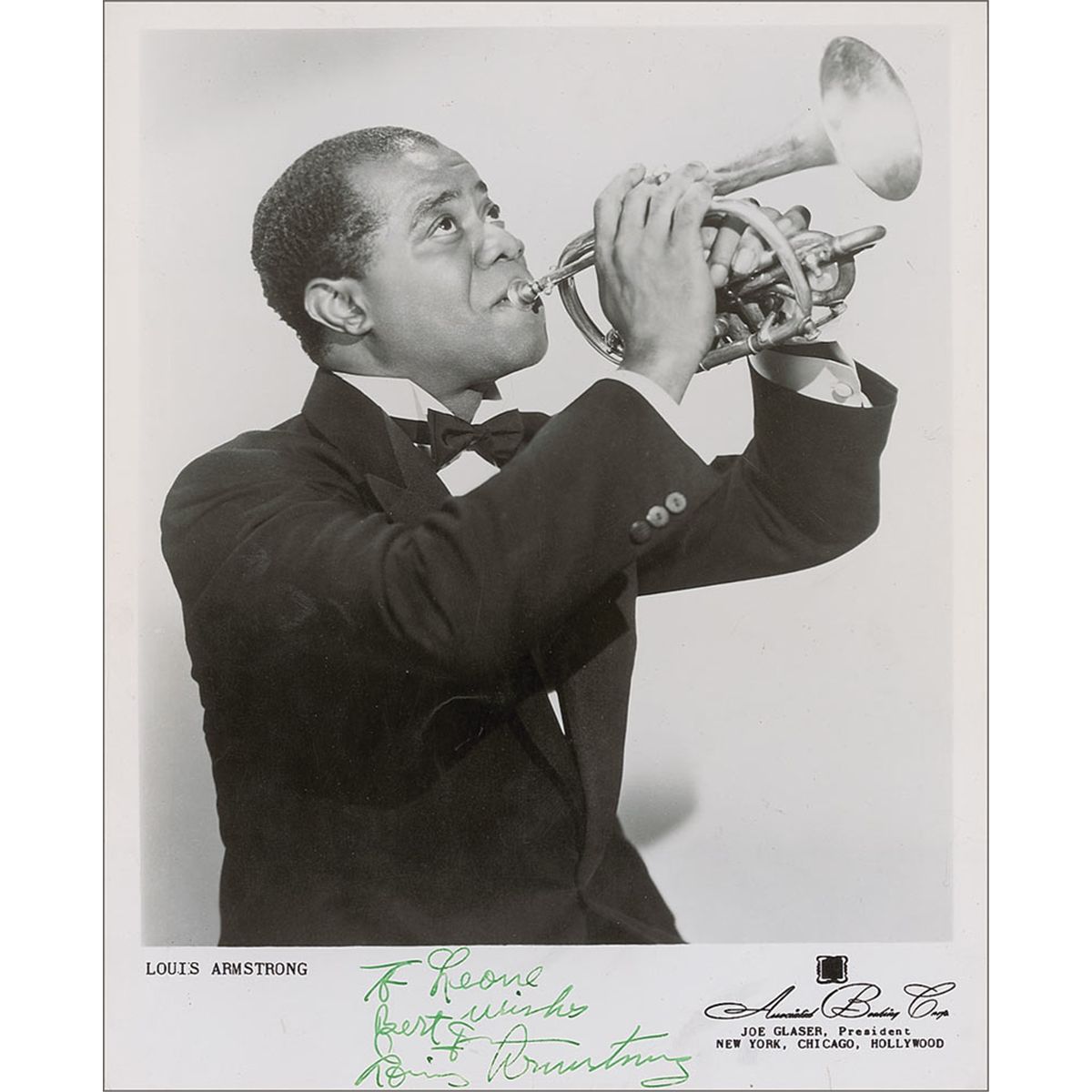 Vintage glossy 8 x 10 promotional photo, signed and inscribed in green ink “To Leone, Best wishes, Louis Armstrong.” Some scattered light creases and surface marks, and a bit of irregular adhesion to signature and inscription, otherwise fine condition.