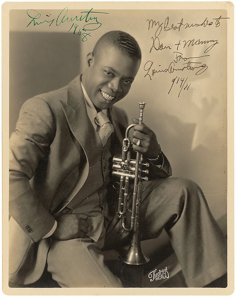 Vintage glossy 8 x 10 Theatrical Chicago publicity photo of a young Armstrong posing with his trumpet, signed and inscribed in fountain pen “My best wishes to Dan & Manny, from Louis Armstrong, 9/14/31,” and signed again years later in green fountain pen, “Louis Armstrong, 1958.” Scattered creases and impressions, some light scattered surface spotting, and light wear to the corner tips, otherwise fine condition.