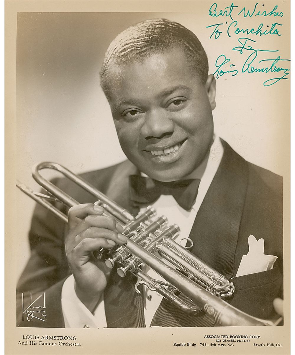 Incredible vintage glossy 8 x 10 publicity photo of a young Armstrong with his trumpet, signed and inscribed in green fountain pen, “Best wishes to Conchita, from Louis Armstrong.” In fine condition, with light toning to borders.