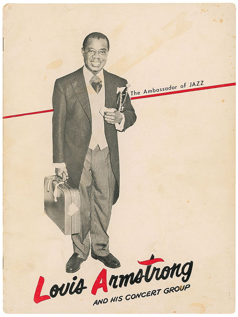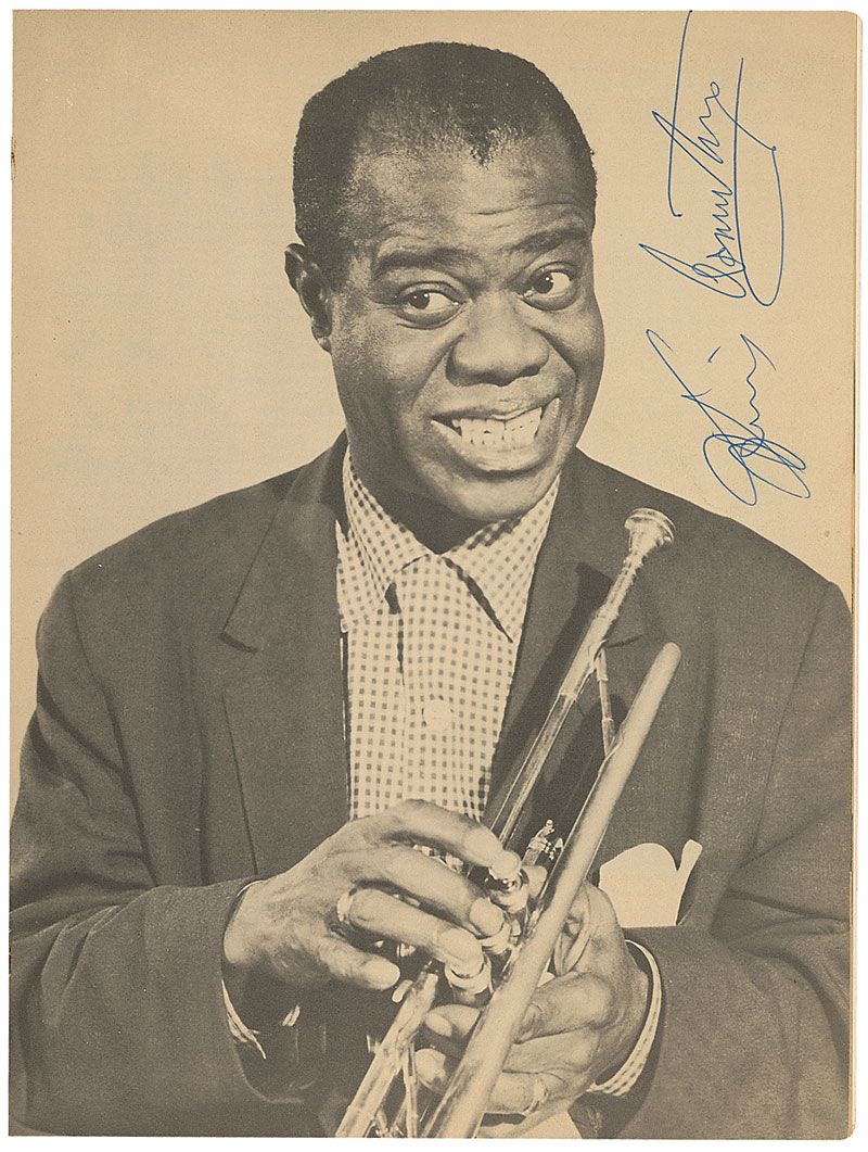 Program for Louis Armstrong and his concert group, 9 x 12, signed inside on a page with his image in blue ballpoint. Also signed inside by bandmates Velma Middleton, Trummy Young, Billy Kyle, Edmond Hall, and Barrett Deems. Scattered toning and soiling to front cover, otherwise fine condition; the interior pages and signatures are clean and crisp.