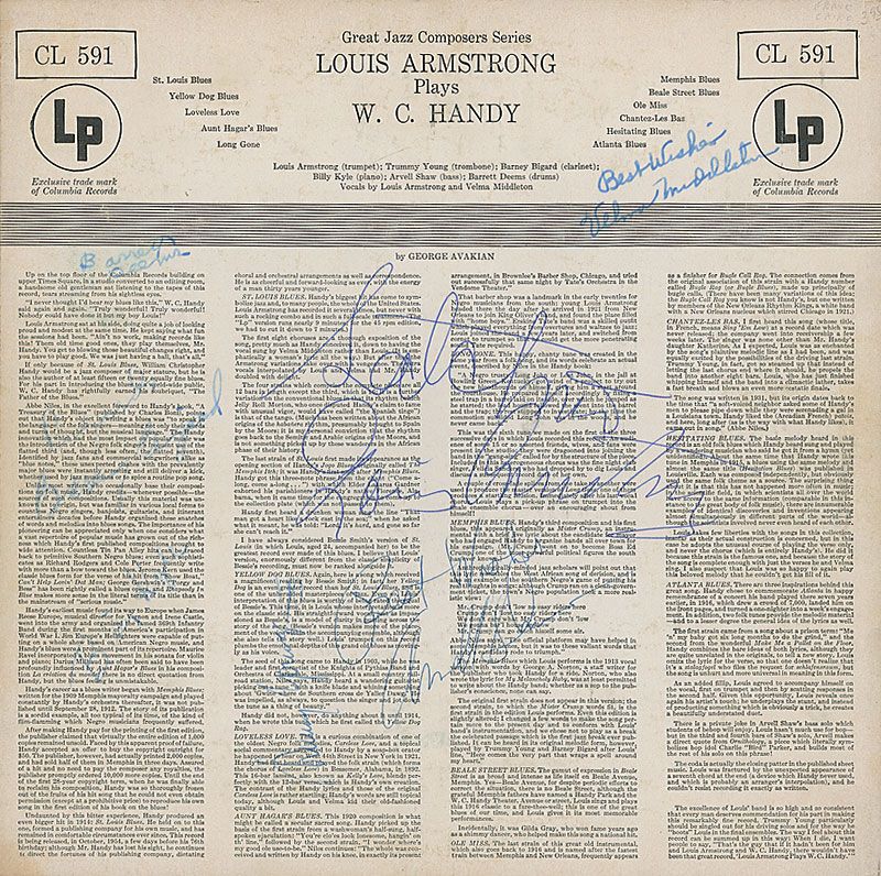 Louis Armstrong Plays W. C. Handy album signed on the back cover in blue ballpoint, “Satchmo, Louis Armstrong,” and also signed in ink and felt tip by Velma Middleton, Arvell Shaw, Billy Kyle, Barney Bigard, Barrett Deems, and Trummy Young. Some light contrast and fading to a few of the other signatures, with Armstrong’s signature remaining crisp and bold, and some scattered light toning, otherwise fine condition. The record is included. Accompanied by a full letter of authenticity from Roger Epperson/REAL.