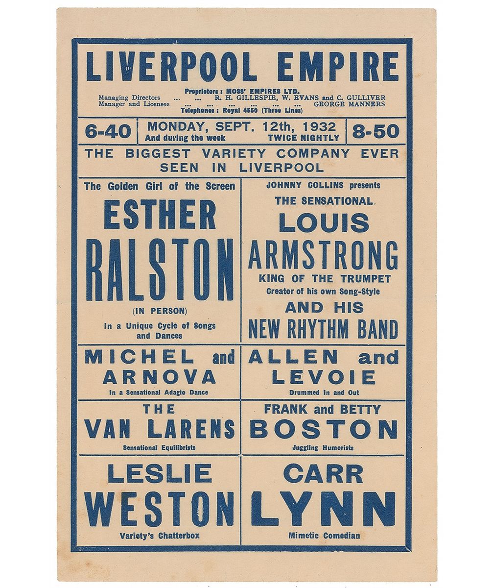 Original handbill for Armstrong’s engagement at the Liverpool Empire beginning on September 12, 1932, 5 x 7.5, featuring Armstrong, Esther Ralston, Leslie Weston, and Carr Lynn. In fine condition, with a central horizontal fold and a bit of mild toning.