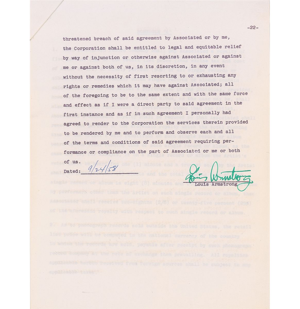 DS, 22 pages, 8.5 x 11, September 24, 1958. Agreement between Paramount Pictures and Associated Booking Corporation in which the latter furnishes the services of Louis Armstrong “to act, play, take part in and perform the role of himself in the motion picture photoplay tentatively entitled The Five Pennies.” Signed at the conclusion by Armstrong in his typical green ink. The main document is followed by a three-page rider, the last page of which is detached. In fine condition, with expected document wear.