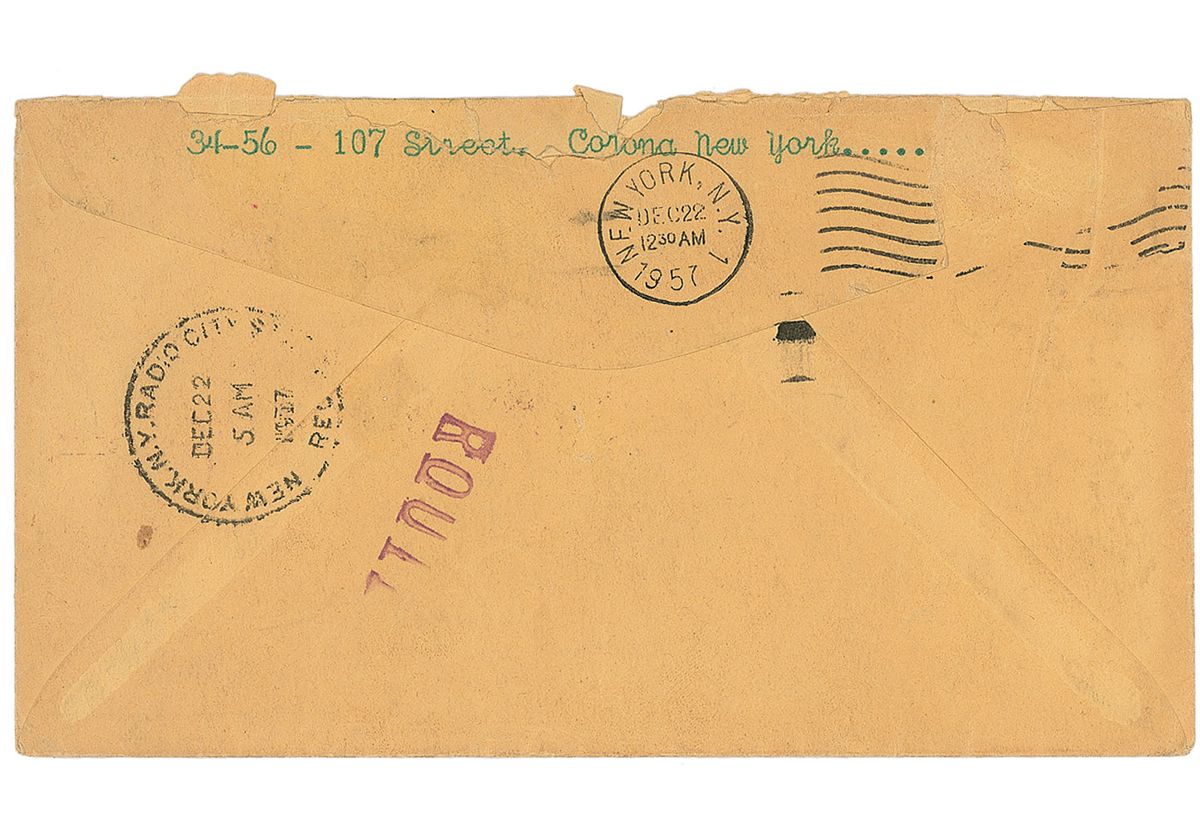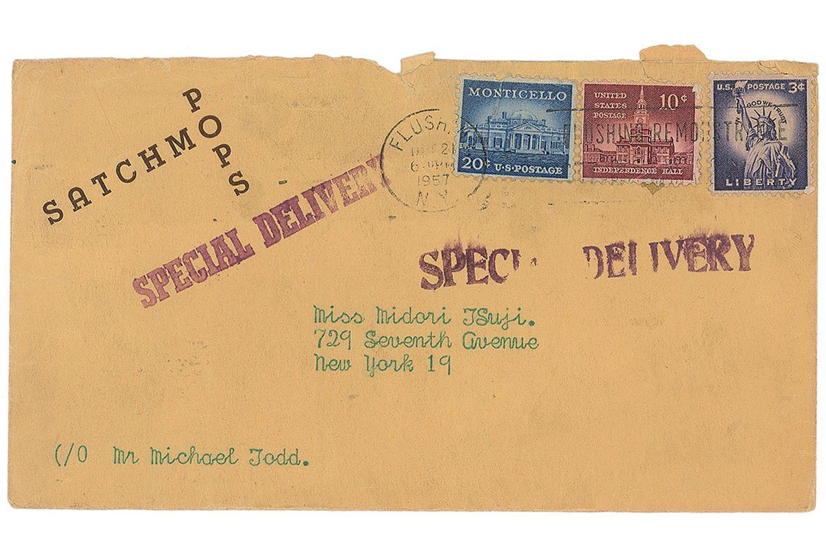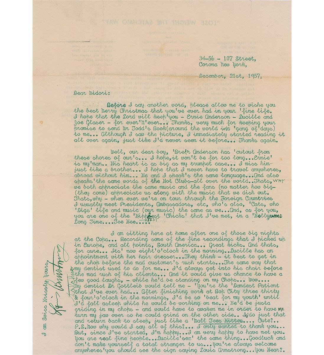 TLS signed “Louis Amrstrong, Satchmo,” one page, 8.5 x 11.5, typed on the reverse of a sheet advertising ‘Lose Weight the Satchmo Way,’ December 21, 1957. Letter to Midori Tsuji. In part: “Well, our dear boy…Anderson has ‘cutout from these shore of our’s…I hope, it won’t be for too long…Ernie’ is my ‘man…His heart is as big as my trumpet case…I miss him just like a brother…I hope that I never have to travel anywheres, abroad without him…He and I speak’s the same language…And also we both appreciate the same music and the fans (no matter how big they come) appreciate us along with the music that we dish out. Thats, why—when ever we’re on tour through the Foreign Countries I usually meet Presidents, Ambassadors, etc, who’s also, ‘cats, who ‘digs’ life and music (our music) the same as we.” In very good condition, with intersecting folds with partial separations and a few tears at the top edge, and light toning. Accompanied by the original mailing envelope.