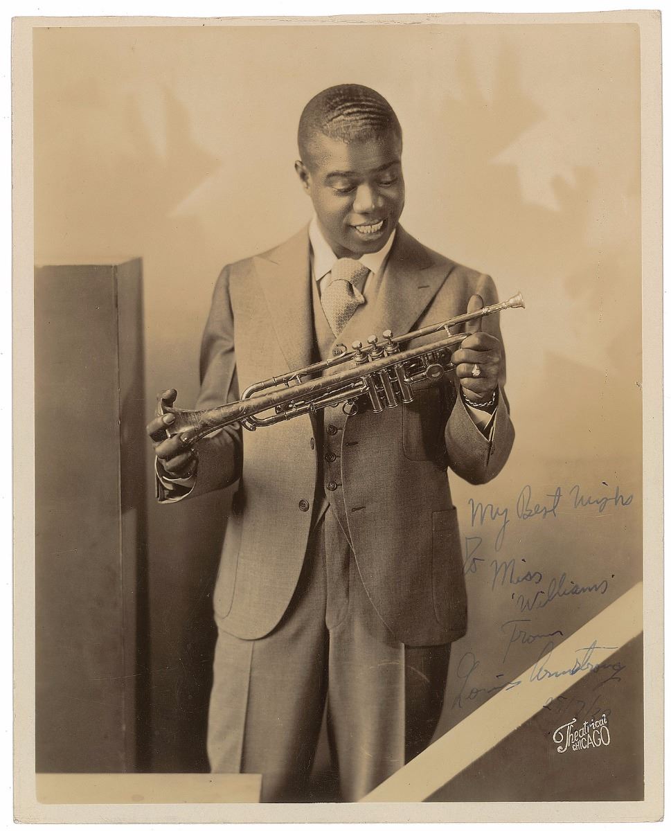 Vintage glossy 8 x 10 Theatrical of Chicago three-quarter length photo of Armstrong admiring his trumpet, signed and inscribed in fountain pen, “My Best Wishes to Miss Williams, from Louis Armstrong, 28/7/32.” In fine condition, with a trimmed top edge. A wonderful and unusually early signed portrait, scarce from this classic era.