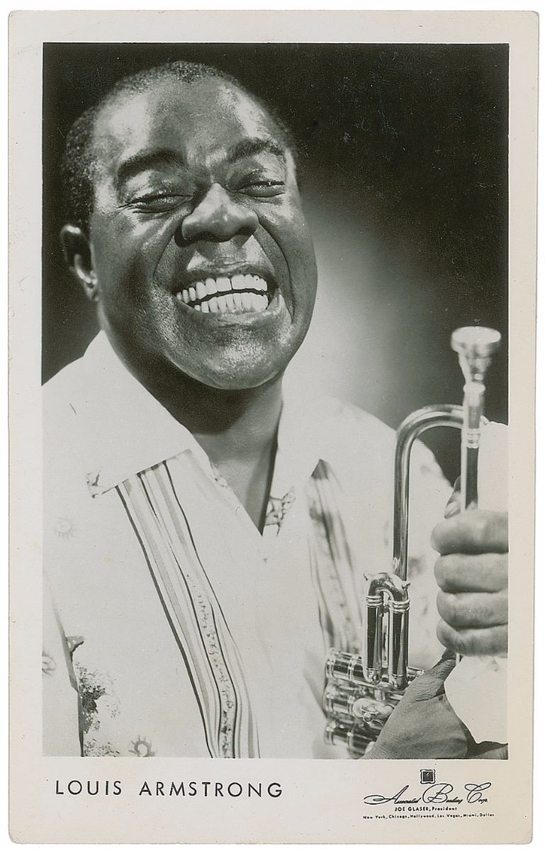 Choice glossy 5.5 x 3.5 postcard photo of Armstrong holding his trumpet and enthusiastically smiling, signed and inscribed on the reverse in blue ballpoint, “To the Brooks Children, Louis Armstrong.” In fine condition.