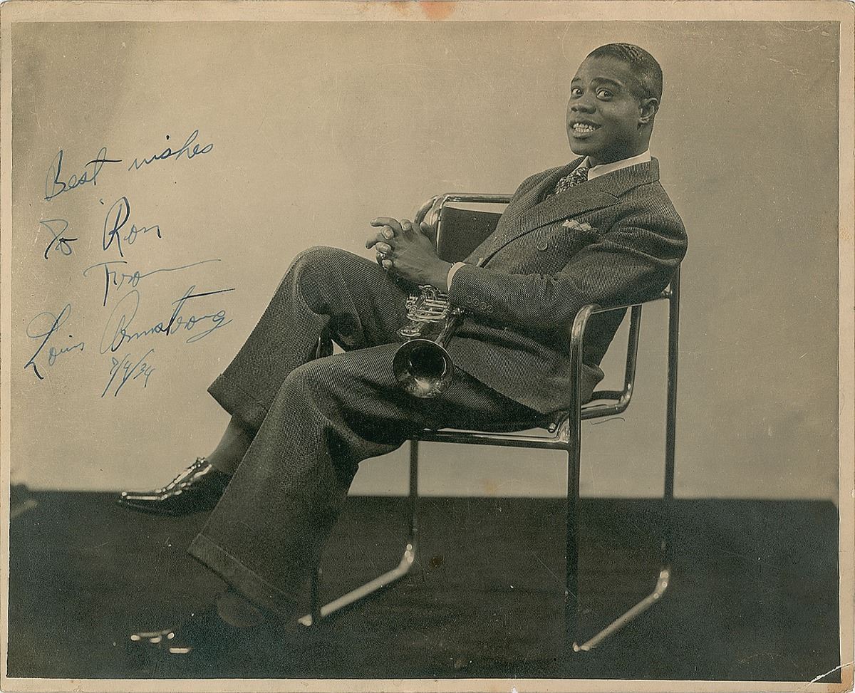 Vintage matte-finish 9.75 x 8 full-length photo of Armstrong lounging in a chair with his trumpet, signed and inscribed in fountain pen, “Best wishes to Ron, from Louis Armstrong, 9/4/34.” Reverse bears an Ava Studio copyright stamp. In very good to fine condition, with light silvering, a small stain to upper border, and a tape-repaired lower right corner tip.