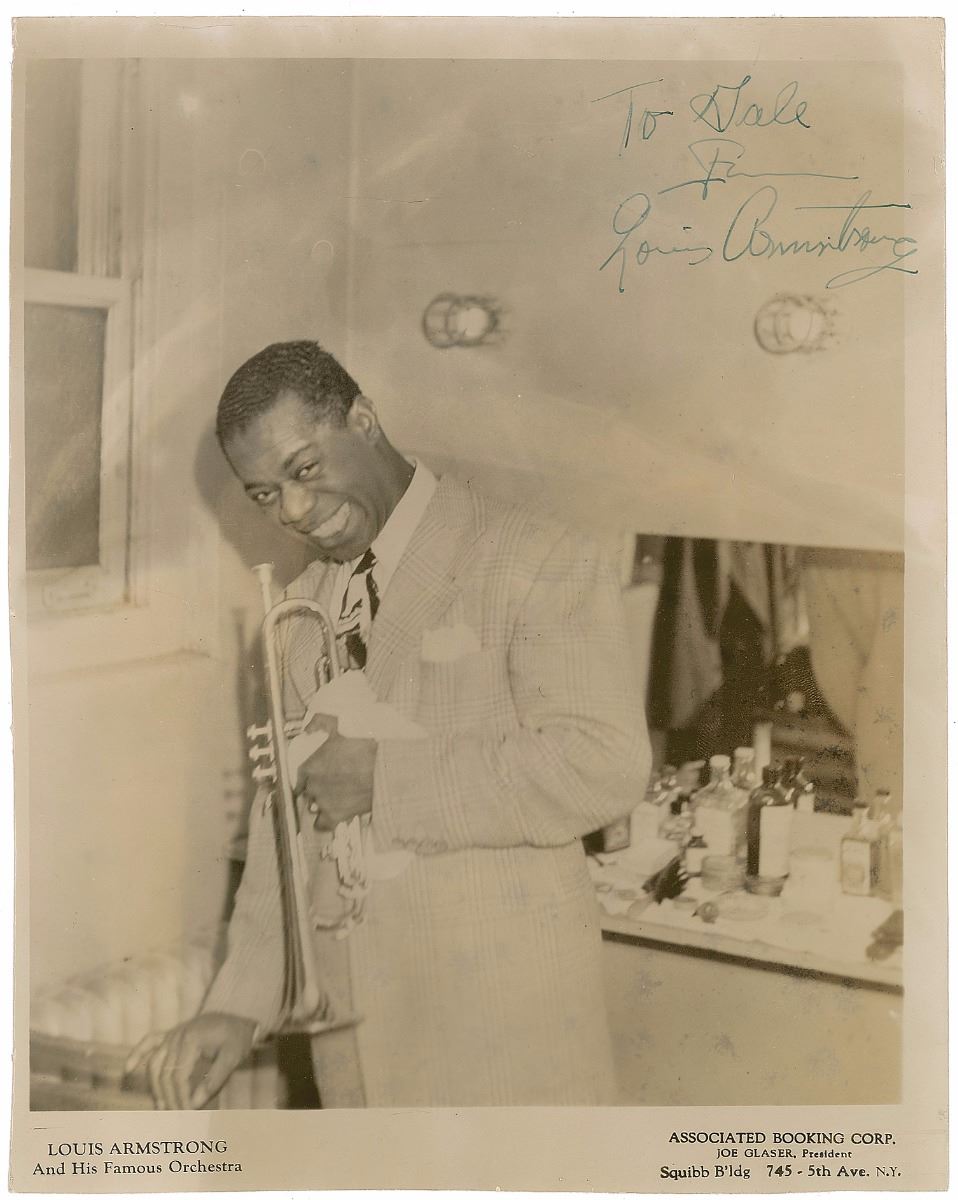 Vintage 7.75 x 9.75 publicity photo of Armstrong smiling with his trumpet in a dressing room, signed and inscribed in black ink, "To Gale, from, Louis Armstrong.” In very good to fine condition, with scattered light creasing and a trimmed left edge.