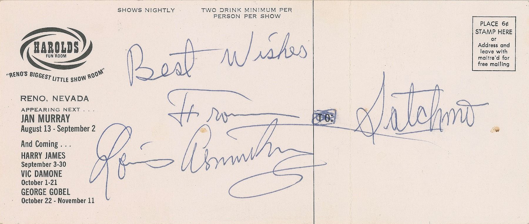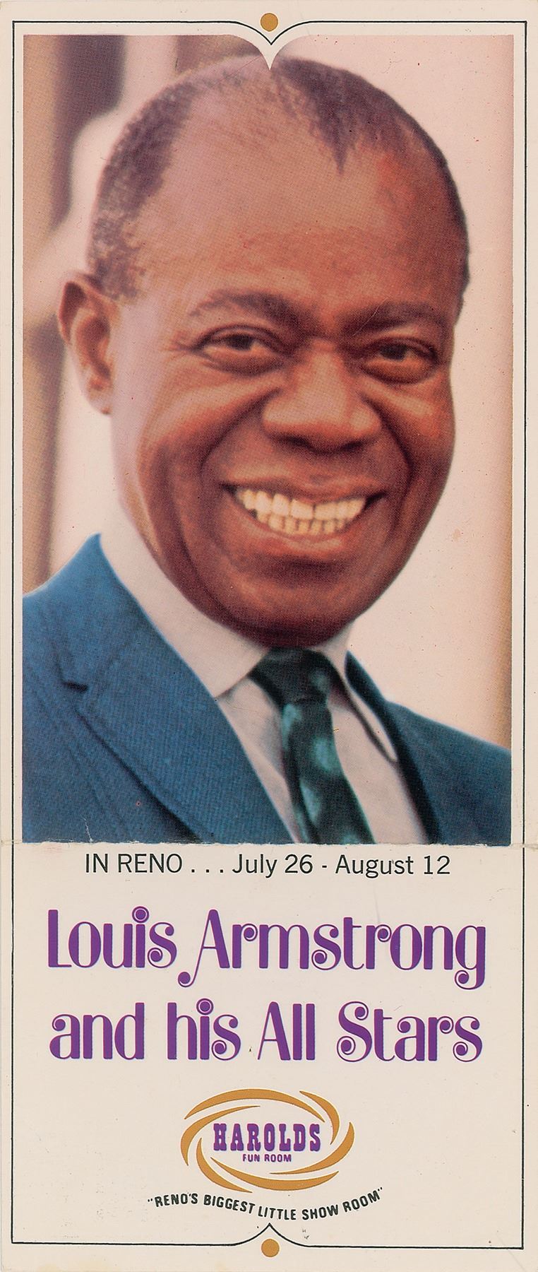 Color promo postcard for Louis Armstrong and his All Stars at Harold's Fun Room in Reno, 3.5 x 8.25, signed on the reverse in ballpoint, "Best Wishes From Louis Armstrong, Satchmo." In fine condition, with a fold beneath the image.