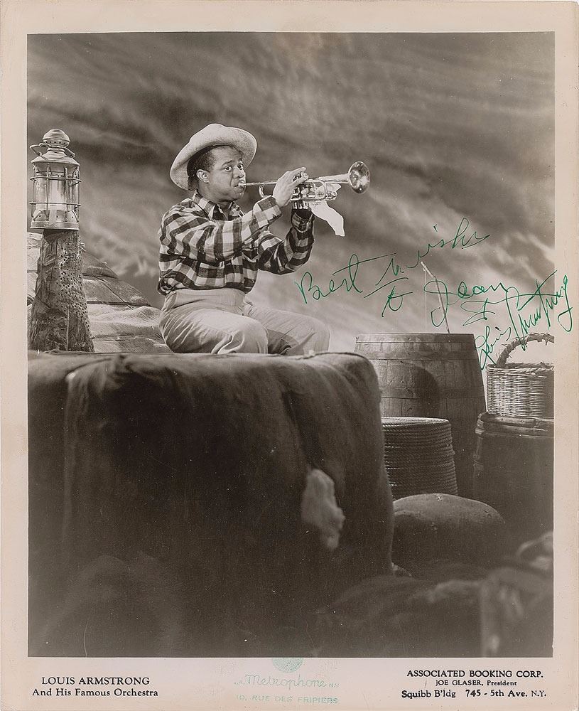 American trumpeter, composer, singer and occasional actor (1901–1971) who was one of the most influential figures in jazz. Vintage glossy 8 x 10 full-length publicity photo of Armstrong playing his trumpet against a rural outdoor backdrop, signed and inscribed in green fountain pen, "Best wishes, to Jean, from, Louis Armstrong.” Front lower border bears a Metrophone stamp, and the reverse features a Regent House stamp. In fine condition.