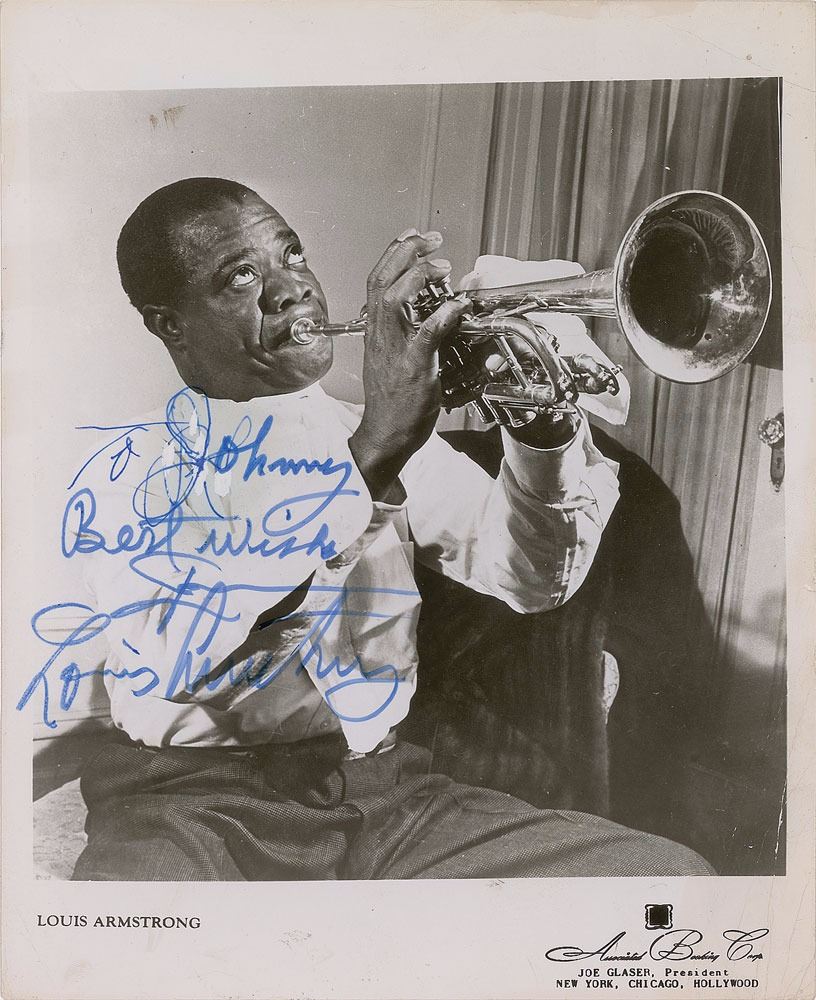 American trumpeter, composer, singer and occasional actor (1901–1971) who was one of the most influential figures in jazz. Glossy 8.25 x 10 publicity photo of Armstrong seated and playing his trumpet, signed and inscribed in blue felt tip, "To Johnny, Best wishes, from, Louis Armstrong.” In very good condition, with creasing, and small bits of missing emulsion near his failed first attempt on the inscription. Accompanied by an unsigned photo of Armstrong holding a French newspaper.