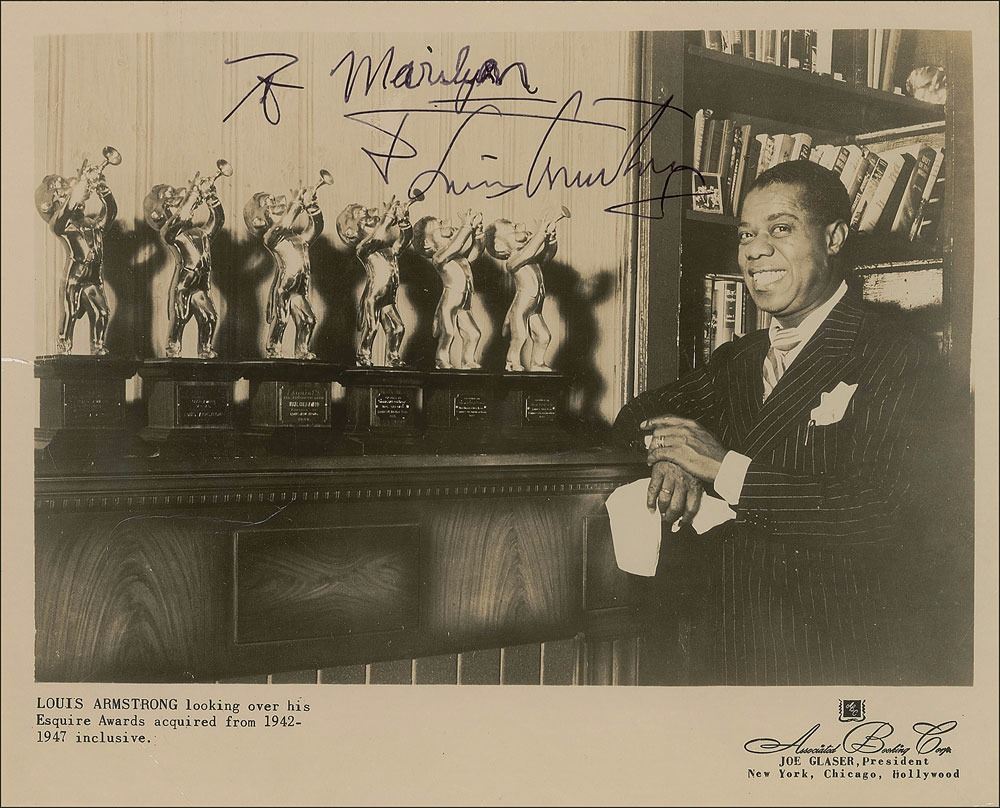 Vintage glossy 10 x 8 publicity photo of Armstrong posing with six of his Esquire Awards, signed and inscribed in black ink, "To Marilyn, Louis Armstrong.” Signed on the reverse in various ink types by Trummy Young, Peanuts Hucko, Billy Kyle, Mort Herbert, Danny Barcelona, and Velma Middleton. In very good to fine condition, with scattered light creasing, and surface impressions on the front from the band member signatures on the reverse.