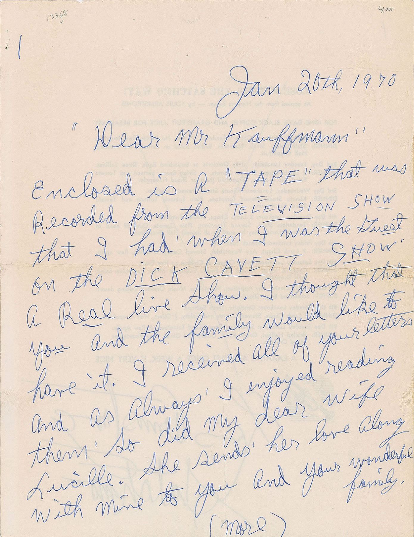 Scarce ALS signed “Satchmo, Louis Armstrong,” four pages, 8.5 x 11, January 20, 1970. Letter to Erich Kauffmann, in full: "Enclosed is a 'TAPE' that was recorded from the television show that I had when I was the Guest on the Dick Cavett Show a real live show. I thought that you and the family would like to have it. I received all of your letters and as always I enjoyed reading them, so did my dear wife Lucille. She sends her love along with mine to you and your wonderful family. I also received the last shipment of Lip Salve that you sent to me. Also the big cans, which Lucille keep in the refrigerator. Every time I look into those cans, they look very fresh and delicious to eat. But Mr. Kauffmann, you forget to mail to me the bill. Please my dear friend, I am ready to send a check to you which will cover everything. Send to me the bill as soon as you can and I will gladly pay you. Because I am always relaxed when I have a lot of Lip Salve. And for God sake you must make it forever. I went down to Philadelphia Pennsylvania to do a T.V. show on the Mike Douglas show. And while Lucille and I were in Philadelphia we got in touch with Mr. Gruner. I met him in Upper Darby, Pennsylvania—years ago when he was the agent for Mr. Franz Schuritz 'Lip Salve'—Ansatz Crème. He is still around + seems to be in good shape maybe you might feel like dropping him a card, or etc…We send best to you and your family. Also we wish you all lots of Happiness." The letter is written on the back of copies of Armstrong's diet plan, "Lose Weight, the Satchmo Way!" In very good to fine condition, with a progressively heavier diagonal crease. Accompanied by the original mailing envelope, addressed in Armstrong's own hand.