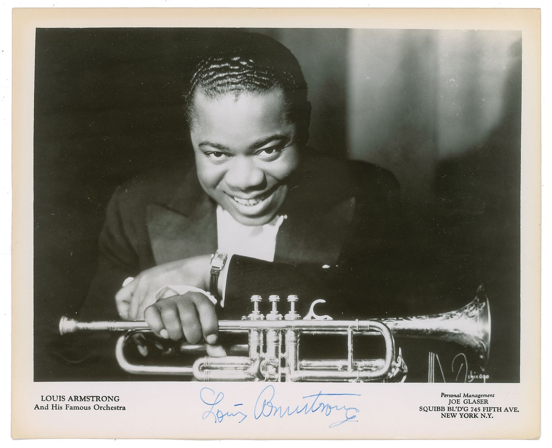 Exceptional vintage glossy 10 x 8 publicity photo of the youthful Armstrong smiling and posing with his trumpet, signed in the lower border in fountain pen. In fine condition.