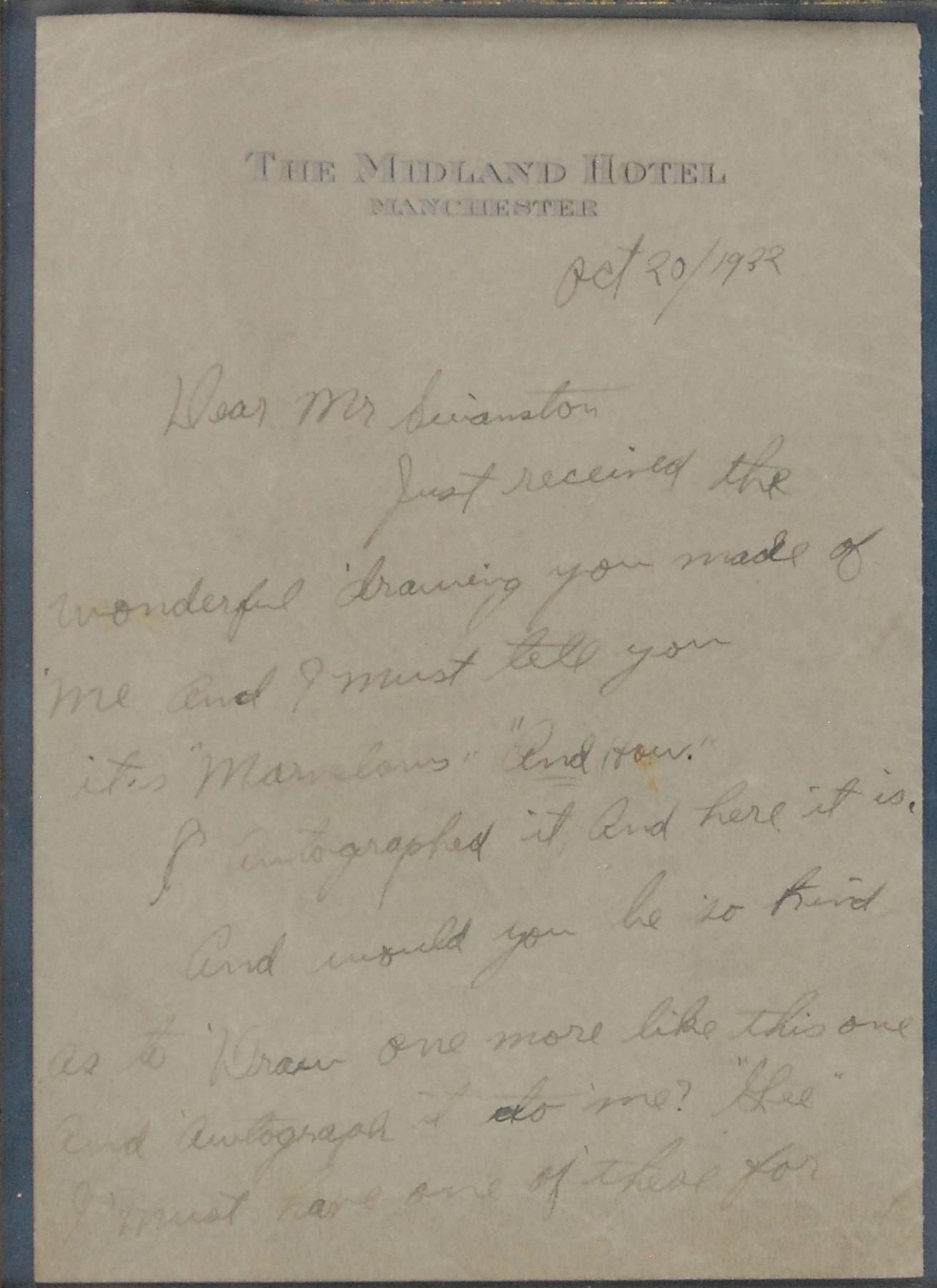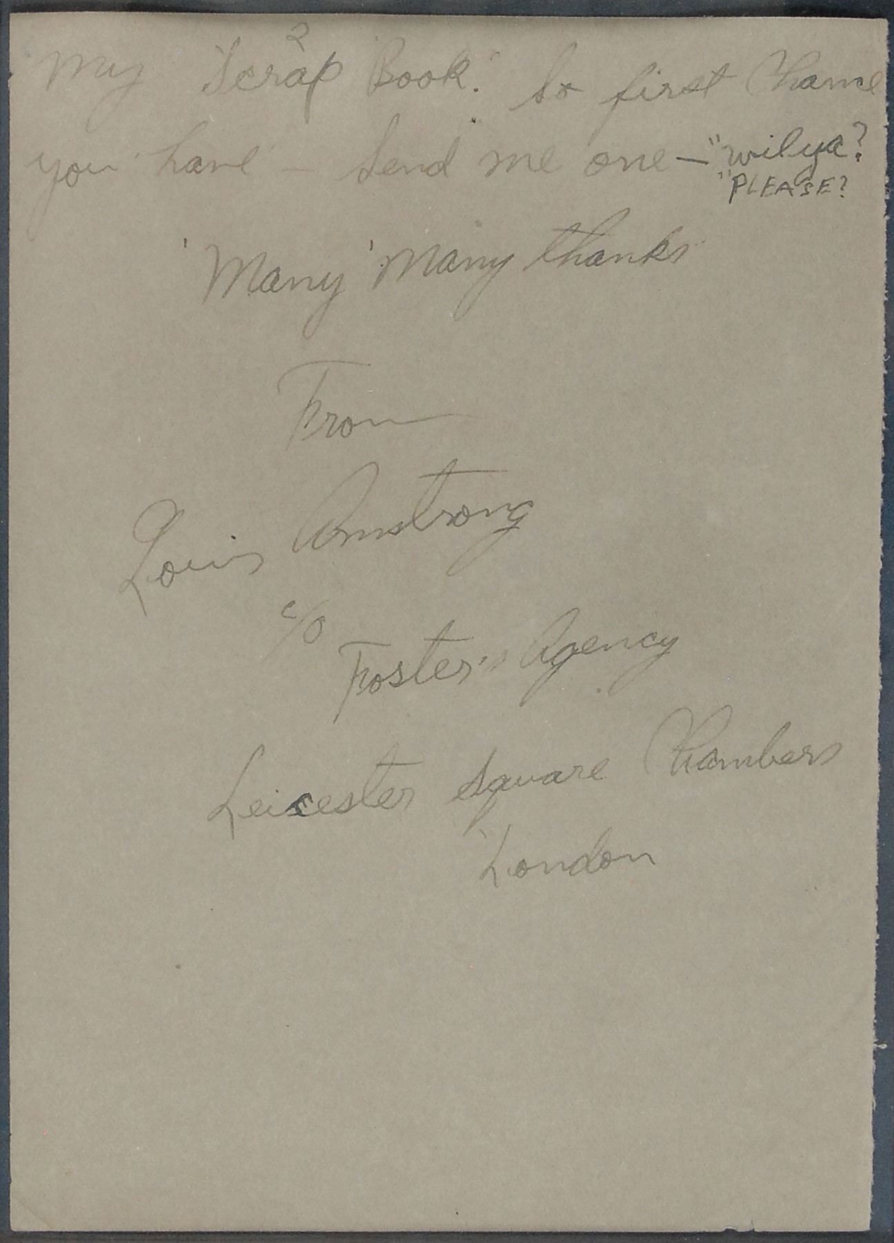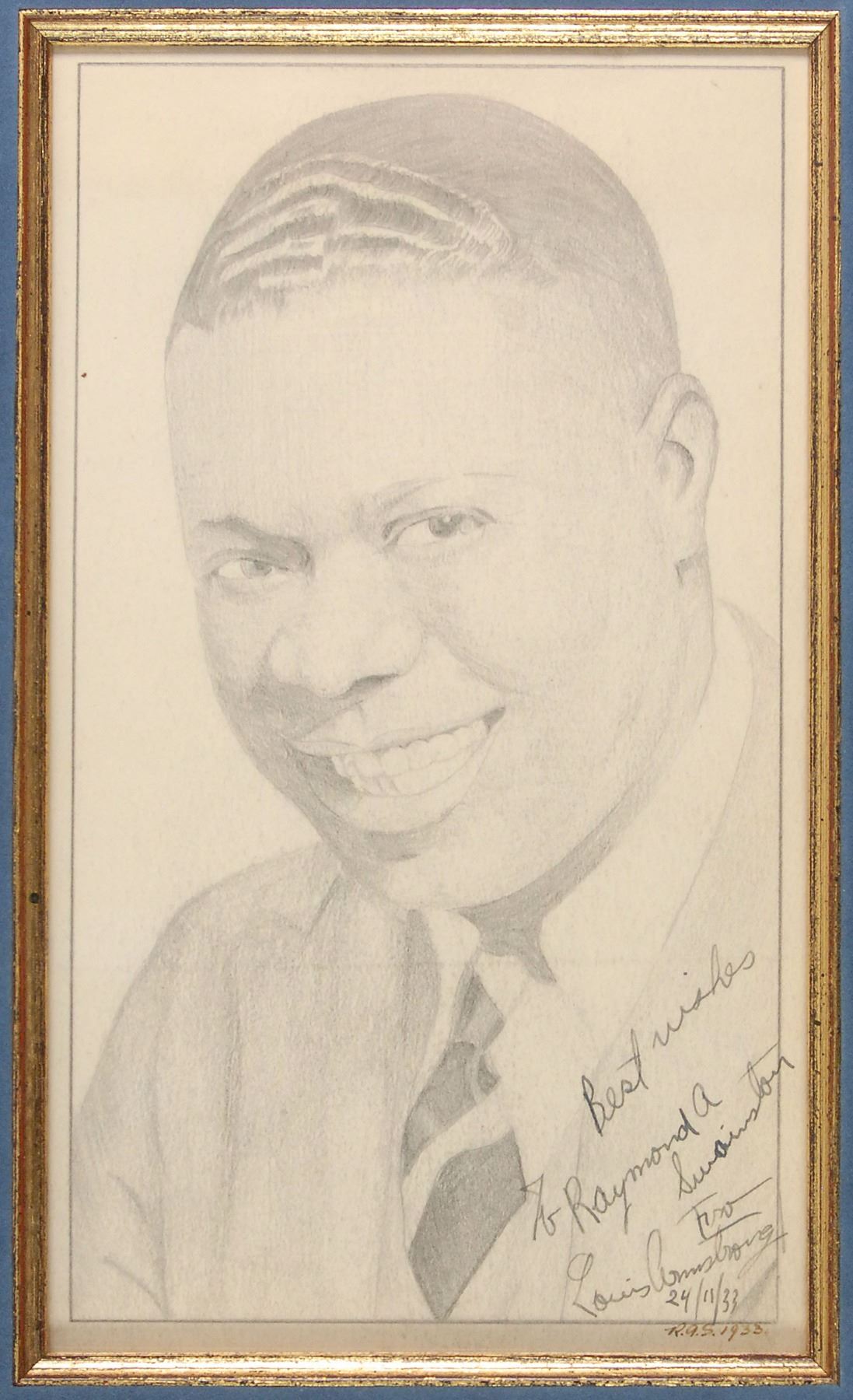Fabulous pairing of an original pencil sketch of Armstrong drawn by an admirer on an off-white 4.75 x 8 sheet, signed and inscribed in fountain pen, "Best wishes to Raymond A. Swainston, From Louis Armstrong, 24/11/33"; and a cordial ALS to Swainston by Armstrong, two pages, 4.75 x 6.75, The Midland Hotel letterhead, October 20, 1932, in full: "Just received the wonderful drawing you made of me and I must tell you, it's 'marvelous' 'and how' I autographed it, and here it is. And would you be so kind as to draw one more like this one and autograph it to me? 'Gee' I must have one of these for my 'scrap book.' So first chance you 'have'-Send me one-'Wilya?' 'PLEASE?'" Archivally suede-matted and framed together with a biographical plaque to an overall size of 20.5 x 33. In overall fine condition, with light creases to the letter. Based on the discrepancy between the date Armstrong signed the sketch and the date of the letter, he and Swainston must have corresponded and exchanged sketches at least a few times during the early 1930s. An exquisite and unusual set of items sent from an iconic celebrity to his admirer.