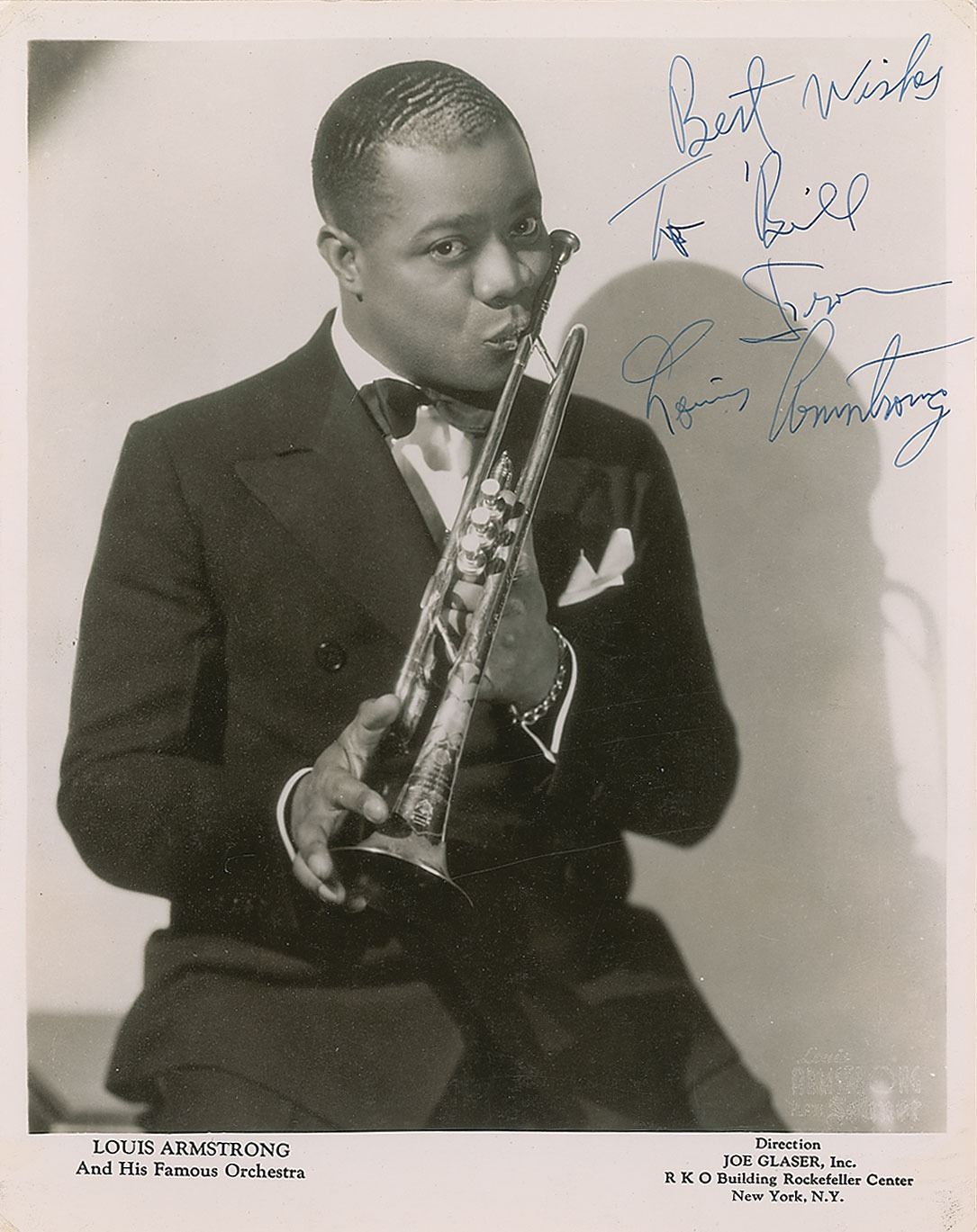 Exceptional vintage pearl-finish 8 x 10 publicity photo of Armstrong planting a kiss on his trumpet, signed and inscribed in fountain pen, "Best wishes to Bill from Louis Armstrong.” Lower right corner bears a faded promotional caption: "Louis Armstrong Plays Selmer." In fine condition, with some light rippling to the right edge.