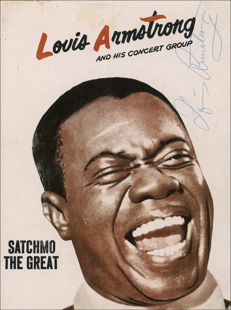 Original vintage program from one of Armstrong’s concert tours, 9 x 12, full of photos of Armstrong, his band, as well as world-wide accolades, signed vertically on the front cover in blue ballpoint. A few small creases, and some scattered light toning, edge dings, and soiling to cover, otherwise fine condition. RRAuction COA.