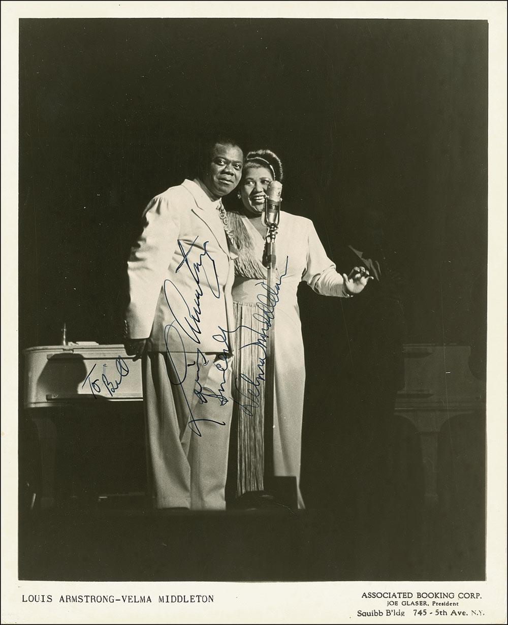 Vintage glossy 8 x 10 publicity photo of Armstrong and Velma Middleton on stage, signed and inscribed in fountain pen “To Bill, Louis Armstrong, Satchmo,” and also signed by Middleton. In fine condition, with a few scattered light creases and surface dings. Pre-certified PSA/DNA and RRAuction COA.