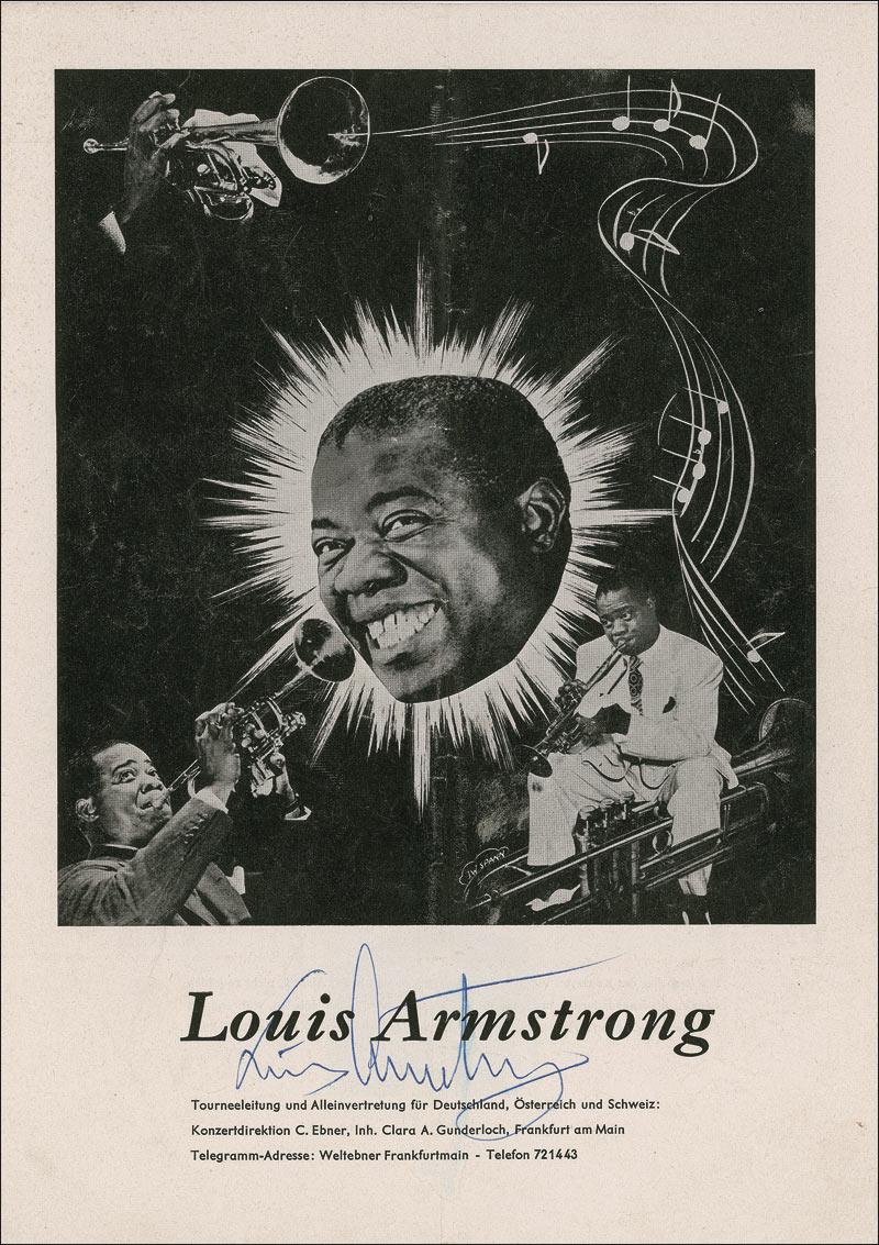 Louis Armstrong concert program, in German, 8.25 x 11.75, 8 pages, signed on the front cover in blue ballpoint by Armstrong. Program is also signed inside on the second page by band members Billy Kyle, Mort Herbert, Peanuts Hucko, Danny Barcelona, and Trummy Young. Light central vertical fold, a small blot to Armstrong’s signature, and light handling wear, otherwise fine condition.