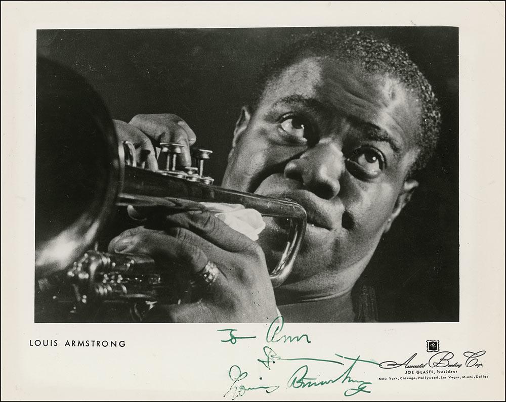 Vintage glossy 10 x 8 photo of Armstrong shown blowing his trumpet, signed and inscribed in green fountain pen “To Ann from Louis Armstrong.” In very good condition, with scattered light creasing and irregular ink adhesion to his first name.