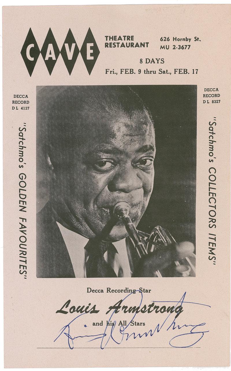 Vintage handbill, 5.75 x 9, for Armstrong’s appearance at the Cave Theatre Restaurant, signed at the bottom in blue ballpoint by Armstrong. In fine condition, with some mild handling wear.