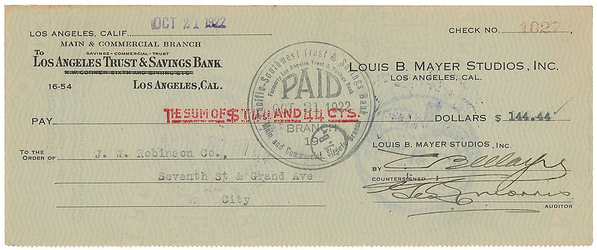 Louis B. Mayer Studios business check, 8.25 x 3.5, filled out in type and signed by Mayer, “L. B. Mayer,” payable to J. W. Robinson Co. for $144.44, October 21, 1922. In fine condition, with expected bank stamps.