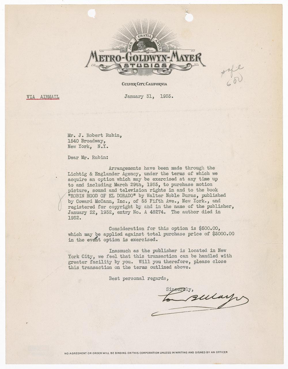 Russian-born American film producer (1882–1957) who formed a film company in 1918 and merged with Samuel Goldwyn to form industry powerhouse Metro-Goldwyn-Mayer in 1924. TLS, one page, 8.5 x 11, Metro-Goldwyn-Mayer Studios letterhead, January 31, 1935. Letter to J. Robert Rubin concerning the acquisition of rights for a Robin Hood feature. In part: “Arrangements have been made through the Lichtig & Englander Agency, under the terms of which we acquire an option which may be exercised at any time up to and including March 29th, 1935, to purchase motion picture, sound and television rights in and to the book ‘Robin Hood of El Dorado’ by Walter Noble Burns, published by Coward McCann, Inc….and registered for copyright by and in the name of the publisher, January 22, 1932….The author died in 1932. Consideration for this option is $500.00, which may be applied against total purchase price of $5000.00 in the event option is exercised.” Small tear along a mailing fold, light edge toning, two punch holes at top edge, a few notations in pencil, and a PSA/DNA authentication label affixed to the reverse, otherwise fine condition.