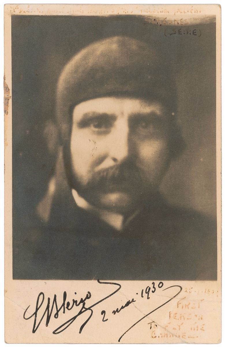 French engineer and aviator (1872–1936) who made the first crossing of a large body of water in a heavier-than-air craft when he flew across the English Channel in 1909. Vintage 3.5 x 5.5 French postcard photo of Bleriot wearing a flight cap, boldly signed in the lower border in fountain pen, “L. Bleriot, 2 Mai 1930.” In very good condition, with slight silvering, and adhesive remnants, faded collector’s notations to front and copious notations to reverse, and creasing to borders (the latter affecting portions of the signature). The Leon Ford Collection.