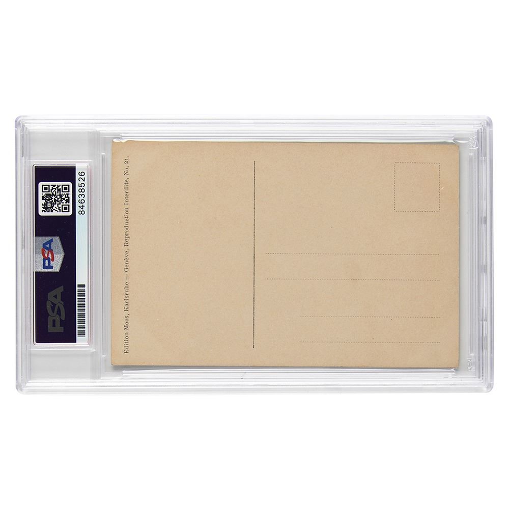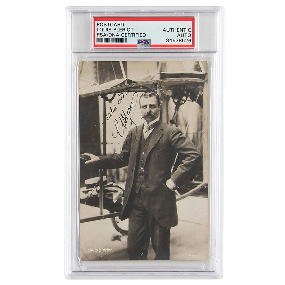 Vintage matte-finish 3.5 x 5.25 postcard photo of Louis Bleriot by photographer Henri Manuel, signed in fountain pen, "Salut cordial, L. Bleriot." In very fine condition. Encapsulated in a PSA/DNA authentication holder.