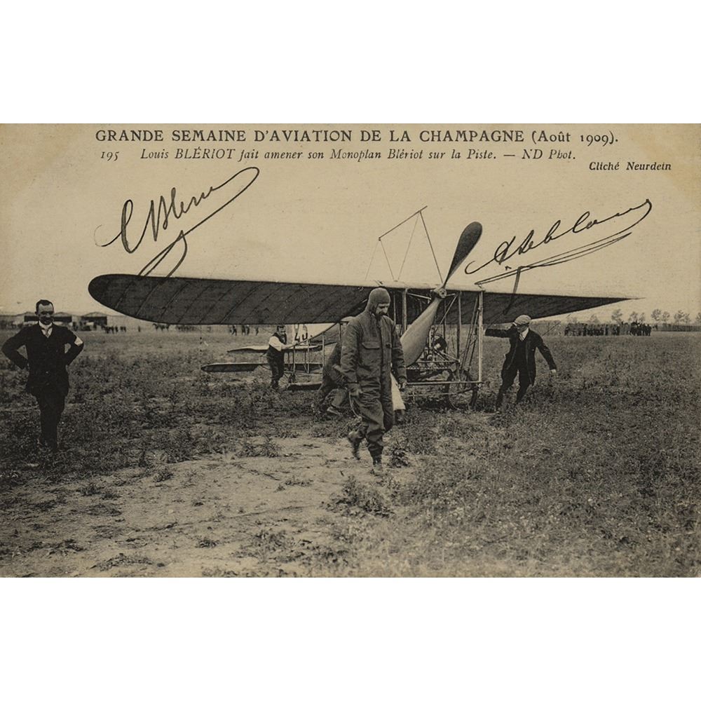 Scarce vintage matte-finish 5.5 x 3.5 postcard photo of Louis Bleriot in his pilot uniform walking in front of his monoplane during the Grande Semaine d'Aviation de la Champagne in August 1909, with his assistant, Alfred Leblanc, walking alongside the aircraft, signed by both men in fountain pen, “L. Bleriot” and “A. Leblanc.” In fine condition, with light toning to the corners.